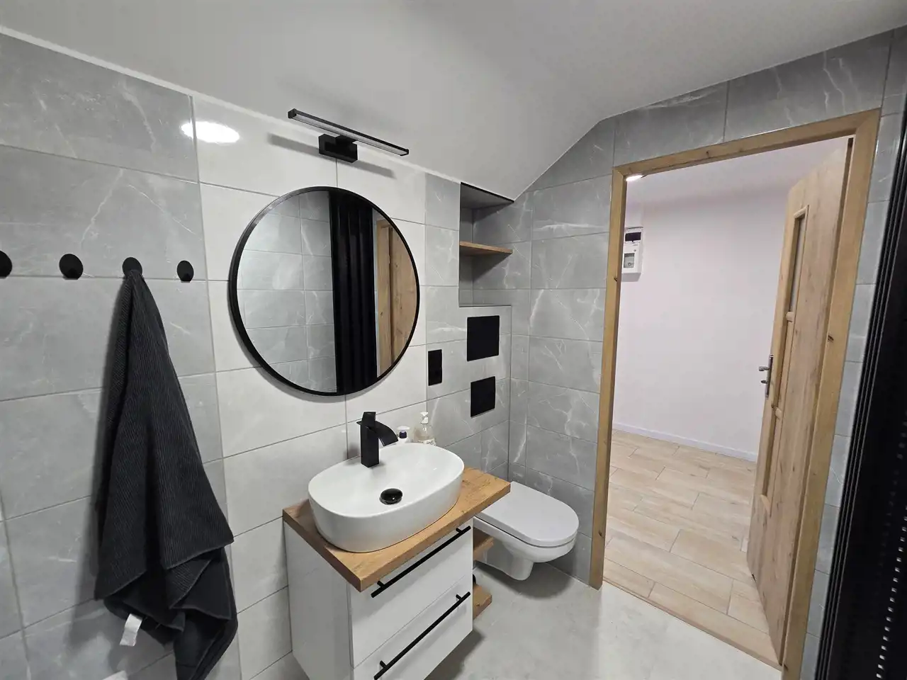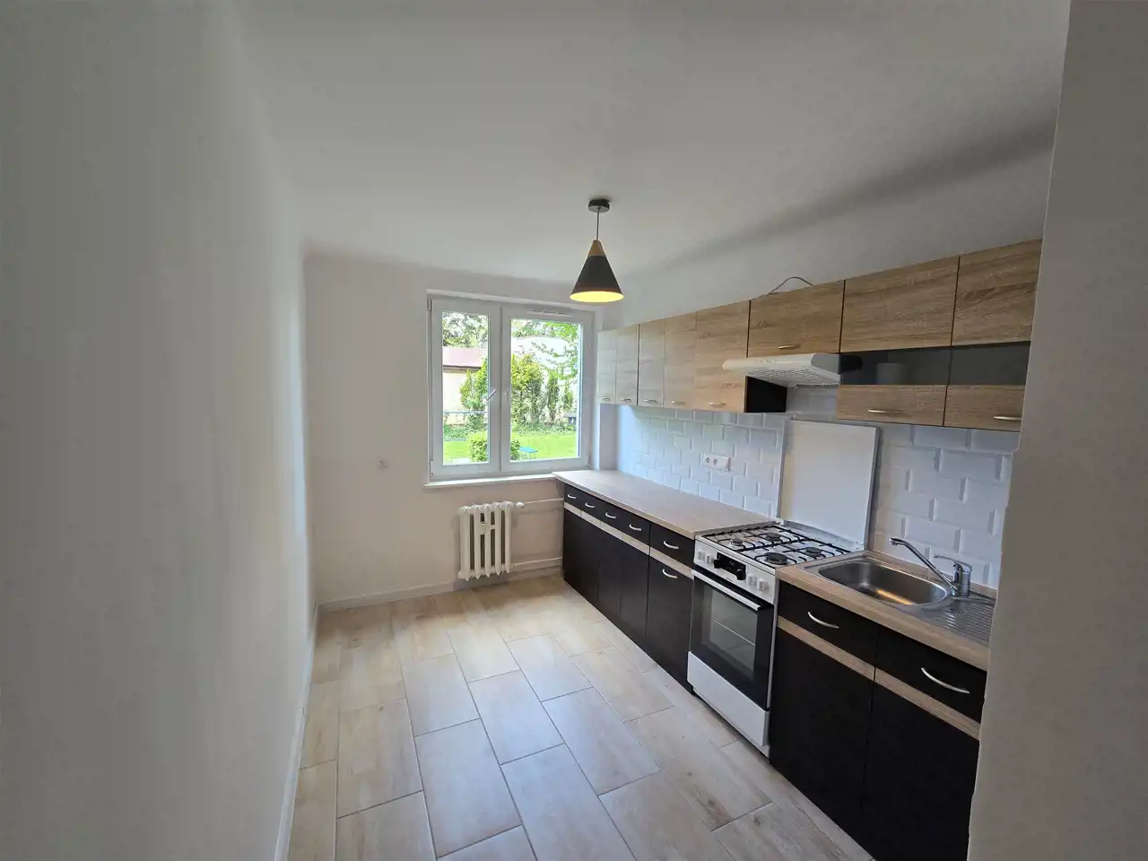 W mieszkaniu 2 pokoje, kuchnia otwarta na ogromny przedpokój, za oknami cisza i zieleń.
