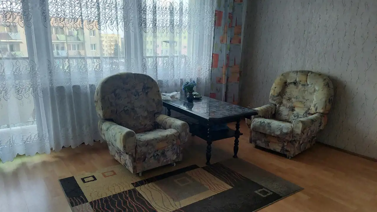 - Mieszkanie dwustronne, środkowe, o wystawie wsch.-zach., z dużym balkonem, dwa pokoje, przedpokój, łazienka z WC.
