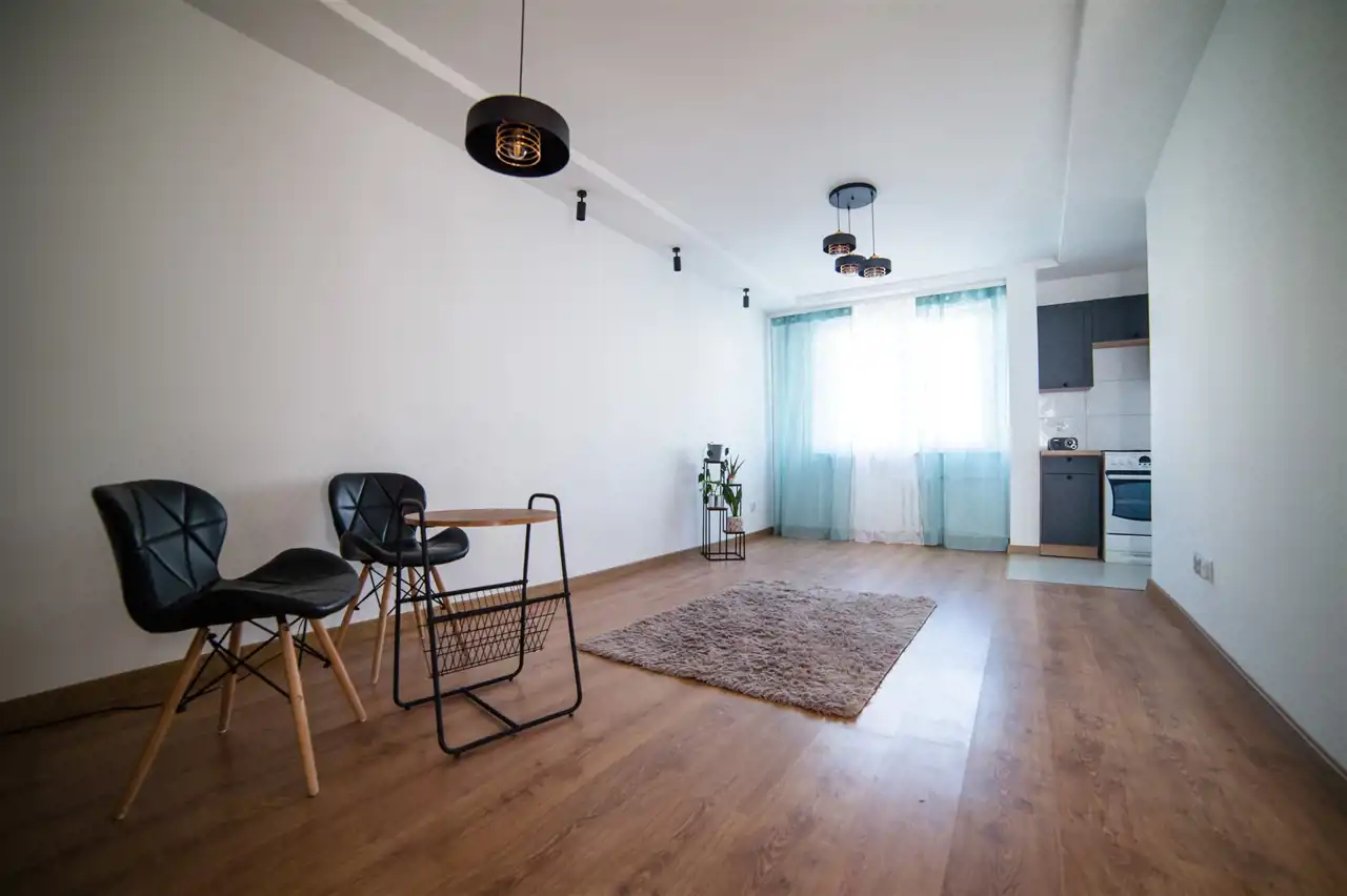 - Przestronny salon z aneksem kuchennym wyposażonym w meble,