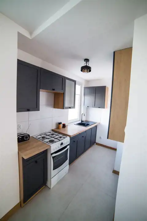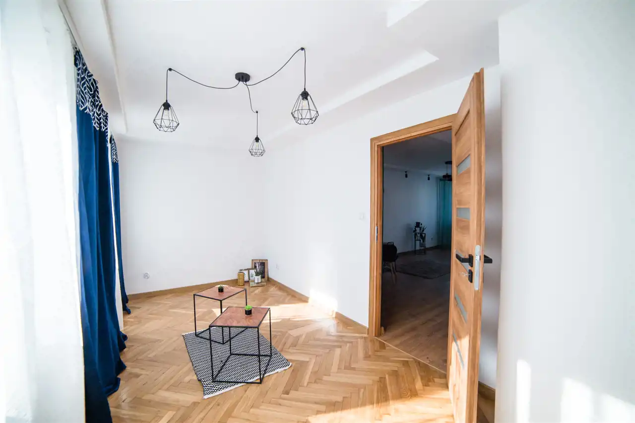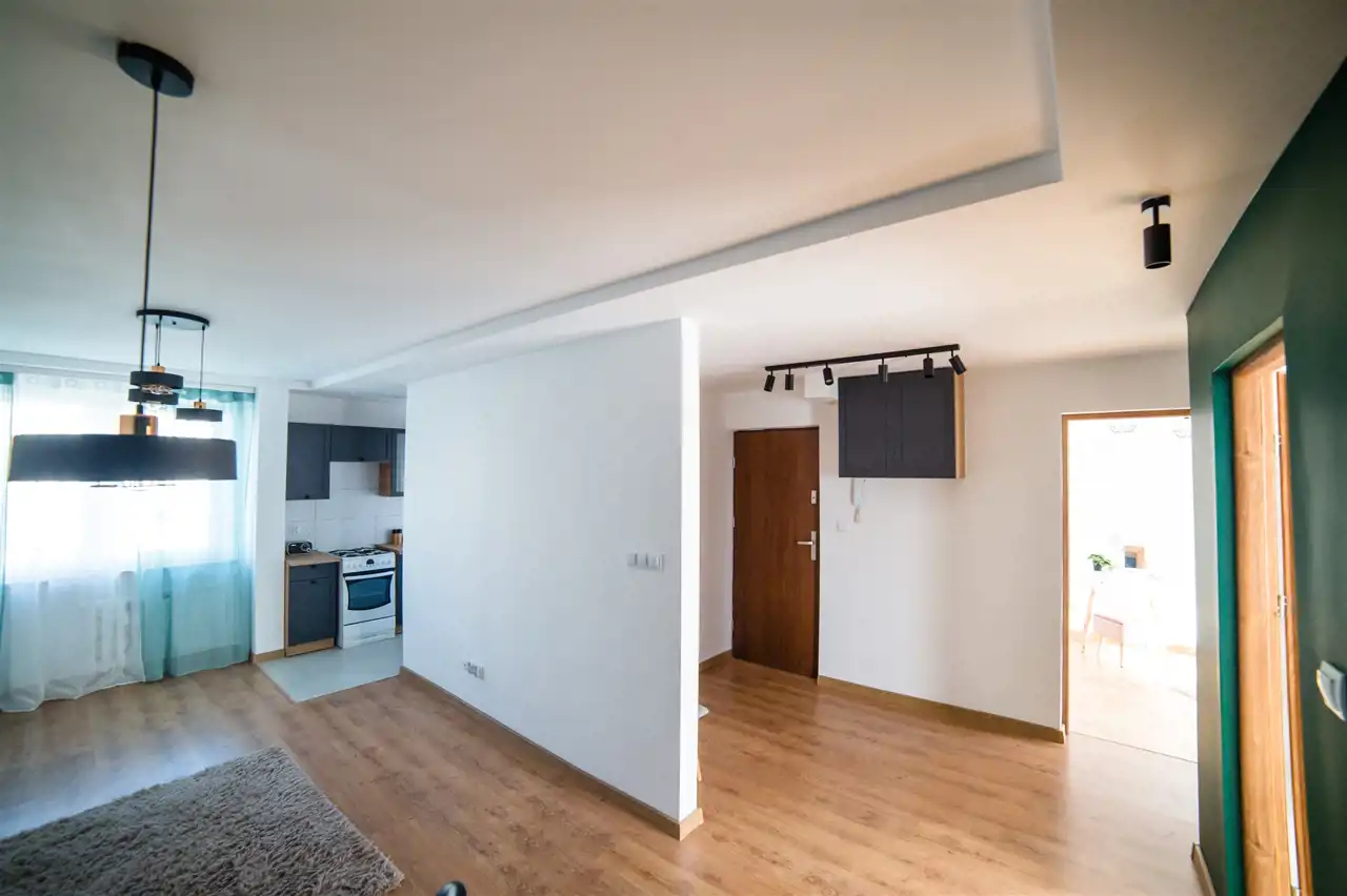 Mieszkanie o metrażu 58,68 m2 po generalnym remoncie, utrzymane jest w nowoczesnej kolorystyce butelkowej zieleni, bieli, szarości i drewna.