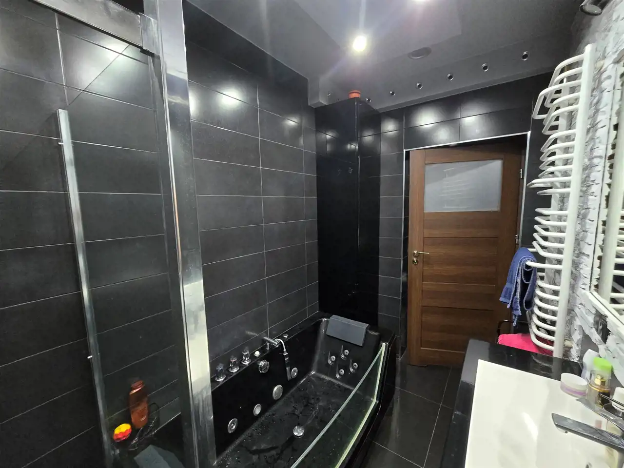 W łazience zamontowano wannę z hydromasażem, w salonie kominek, siłownia. Nowoczesne płytki, panele, gładzie, nowe okna i drzwi, nowe, nowoczesne meble i wyposażenie AGD, nowa armatura łazienkowa