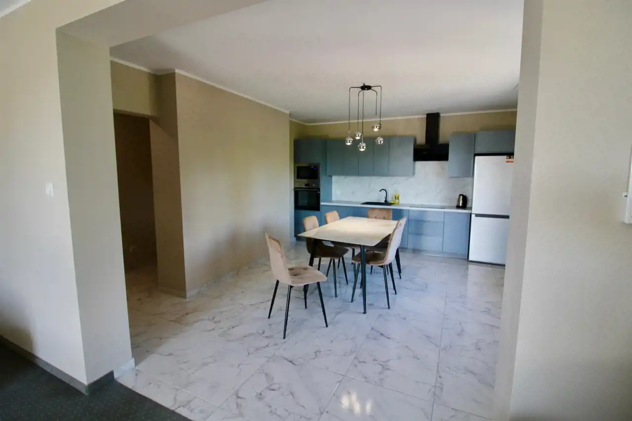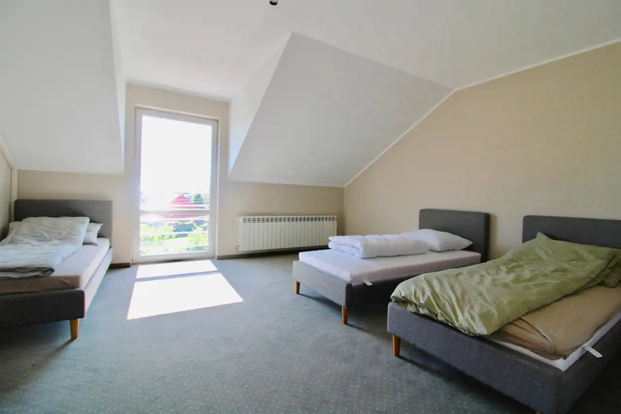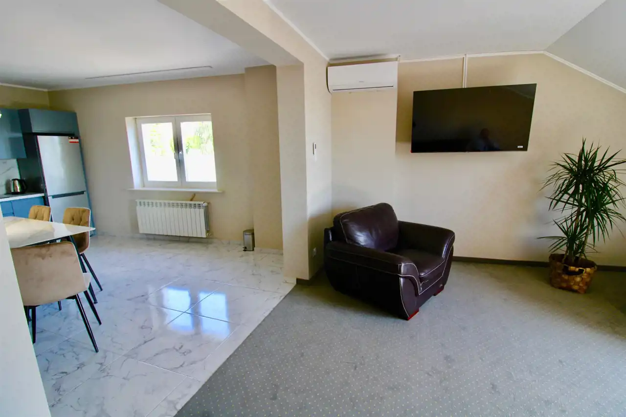 Na najwyższej kondygnacji znajduje się apartament z 2 sypialniami, łazienką, toaletą, kuchnią z jadalnią i salonem. Łącznie ok 35 miejsc.