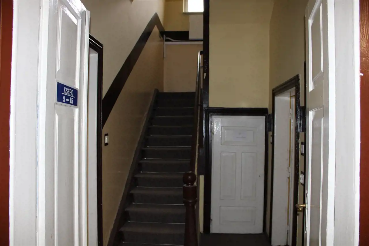 Na pierwsze piętro prowadzą stare drewniane, stylowe schody.