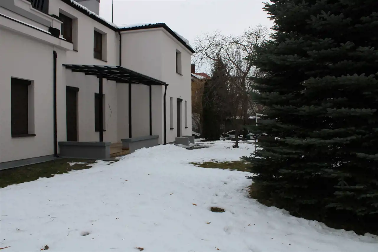 +Obszerną działkę przez frontem budowli przecina także poprzeczna alejka. Na posesję prowadzi brama od ulicy Wardyńskiego, aleja dojazdowa prowadzi na tylną część posesji przed budynek gospodarczy.Cały budynek składa się z 2 kondygnacji.