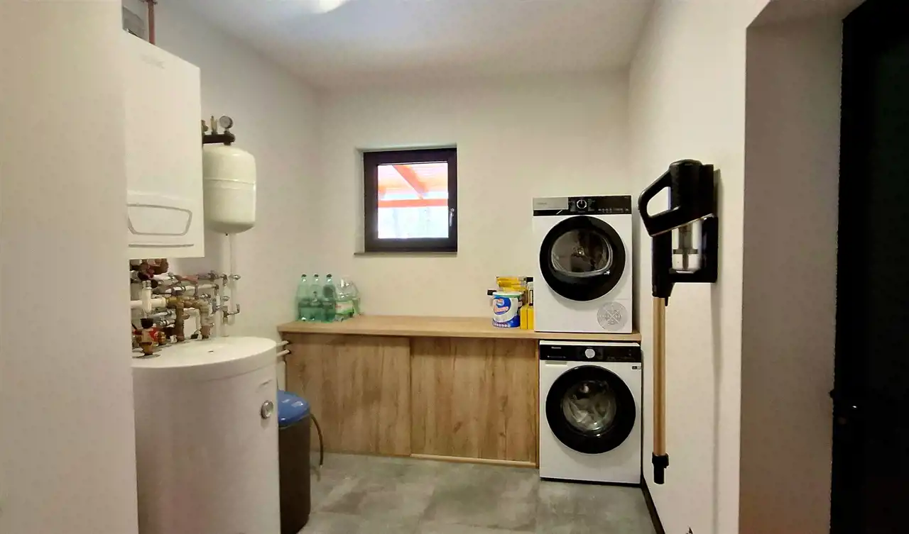 Nowoczesna bryła, dachówka ceramiczna, ogrzewanie gazowe, garaż dwustanowiskowy, wysoki standard wykończenia i wyposażenia ( sprzet AGD wysokiej klasy, meble z litego drewna oraz renomowanych firm np KLER, zmiękczacz do wody, osobna pralnia z pełnym wyposażeniem, rolety elektryczne ) i spójna architektura tworzą całość, która ułatwi Państwo podjęcie decyzji o zakupie tego wyjątkowego domu.