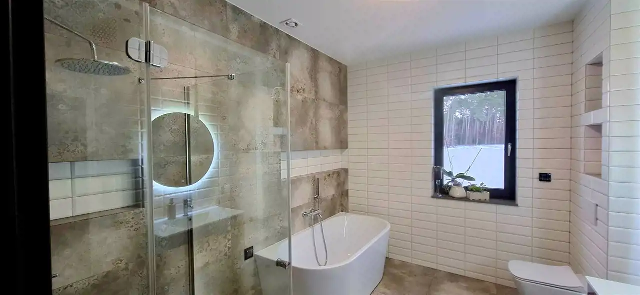 Otwierając drzwi Państwa przyszłego domu, wchodzimy do jasnego wnętrza, gdzie światło naturalne prowadzi do wszystkich pomieszczeń , a starannie dobrane materiały i wyposażenie, budują atmosferę jakości i harmonii. Salon zaprasza do odpoczynku – duże przeszklenia otwierają wnętrze na zadaszony taras, a wolnostojący kominek tworzy ciepły, domowy klimat podczas długich wieczorów.