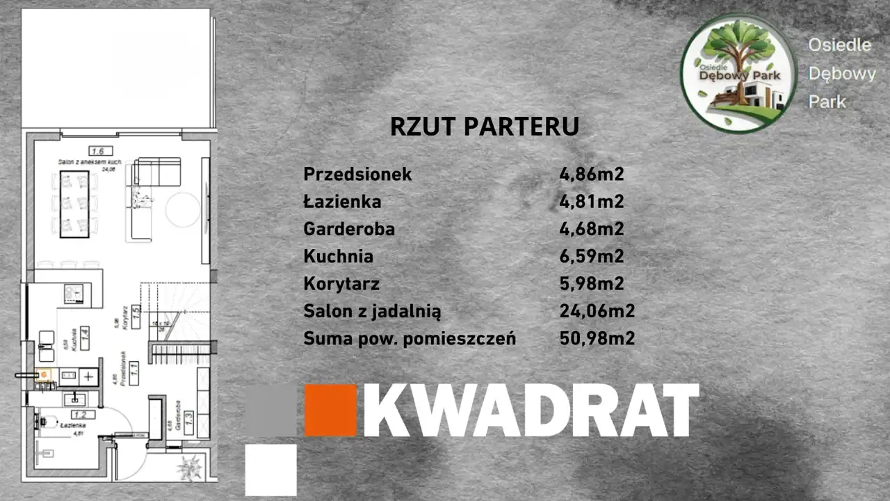 Na parterze o pow. 50,98 m2 znajduje się tzw. część dzienna: salon z jadalnią i kuchnią, łazienka, garderoba oraz korytarz z wiatrołapem.