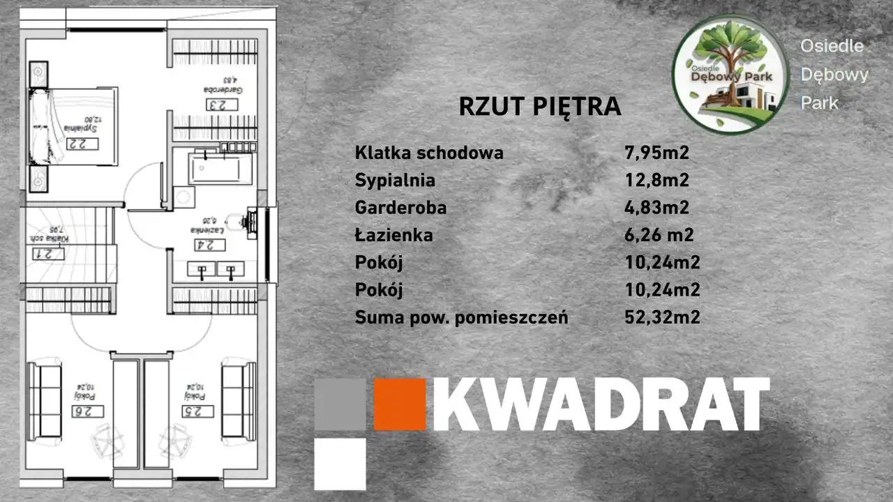 Na piętrze o pow. 52,32 m2 trzy ustawne pokoje, garderoba oraz łazienka.