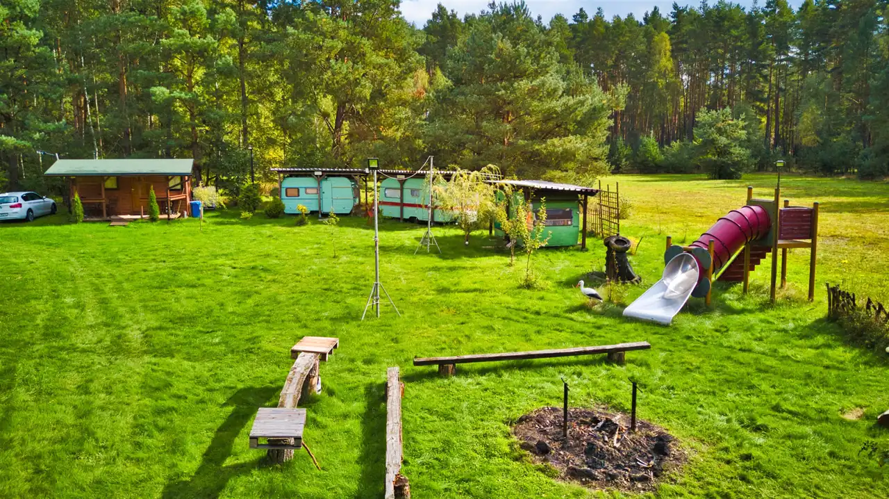 - Teren Rekreacyjny: Miejsce na ognisko, trzy przyczepy kempingowe (dodatkowa baza noclegowa) oraz trzy garaże z magazynkiem.