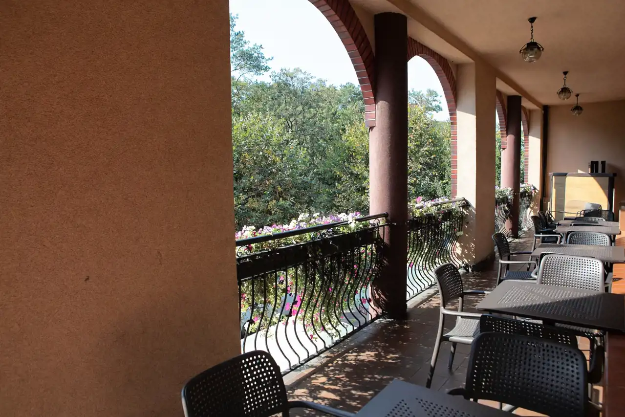 Na I piętrze zlokalizowana jest restauracja o powierzchni ok. 70 m² oraz sala bankietowa o powierzchni ok. 110 m² z pełnym zapleczem kuchennym. Ta część obiektu idealnie sprawdza się przy organizacji przyjęć okolicznościowych, wesel lub wydarzeń firmowych. Z restauracji prowadzi wyjście na taras o powierzchni ok. 60 m² z widokiem na park, co stanowi dodatkowy atut dla gości.