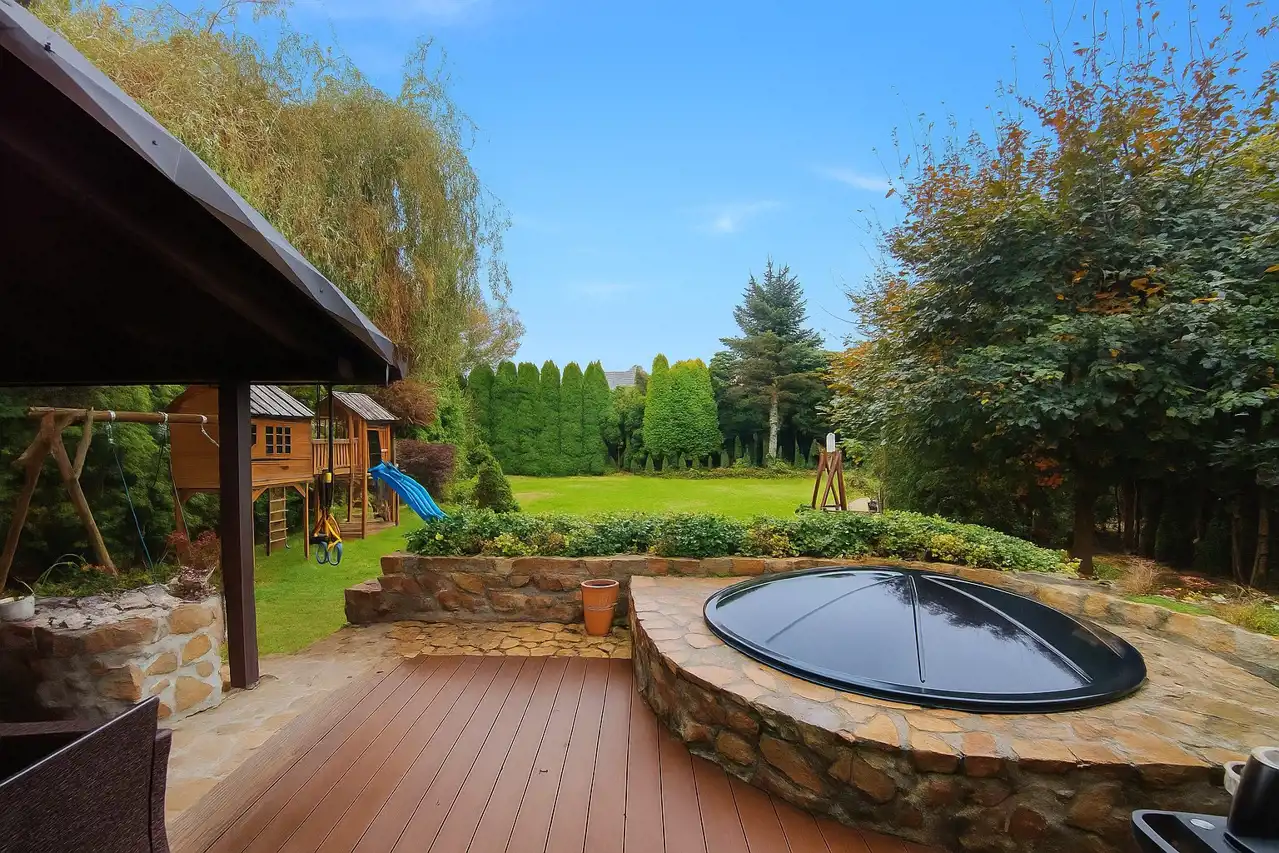Ogrodzona i perfekcyjnie zagospodarowana – pełna zieleni, krzewów i drzew ozdobnych, które zapewniają pełną prywatność.