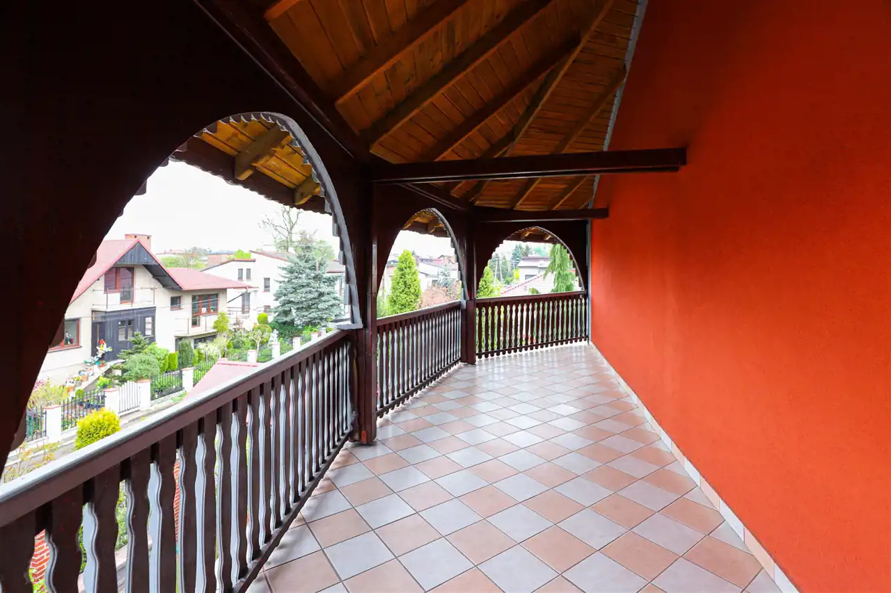 Na powierzchnię budynku składają sie 3 kondygnacje (każda z nich po ok. 90m2) z czego dwie z nich z obszernymi balkonami. Na każdej z kondygnacji sypialnie (w sumie 5) oraz łazienki (4). W przyziemiu garaż, pralnia, sauna z WC i prysznicem, kuchenka letnia oraz pom. gospodarcze.