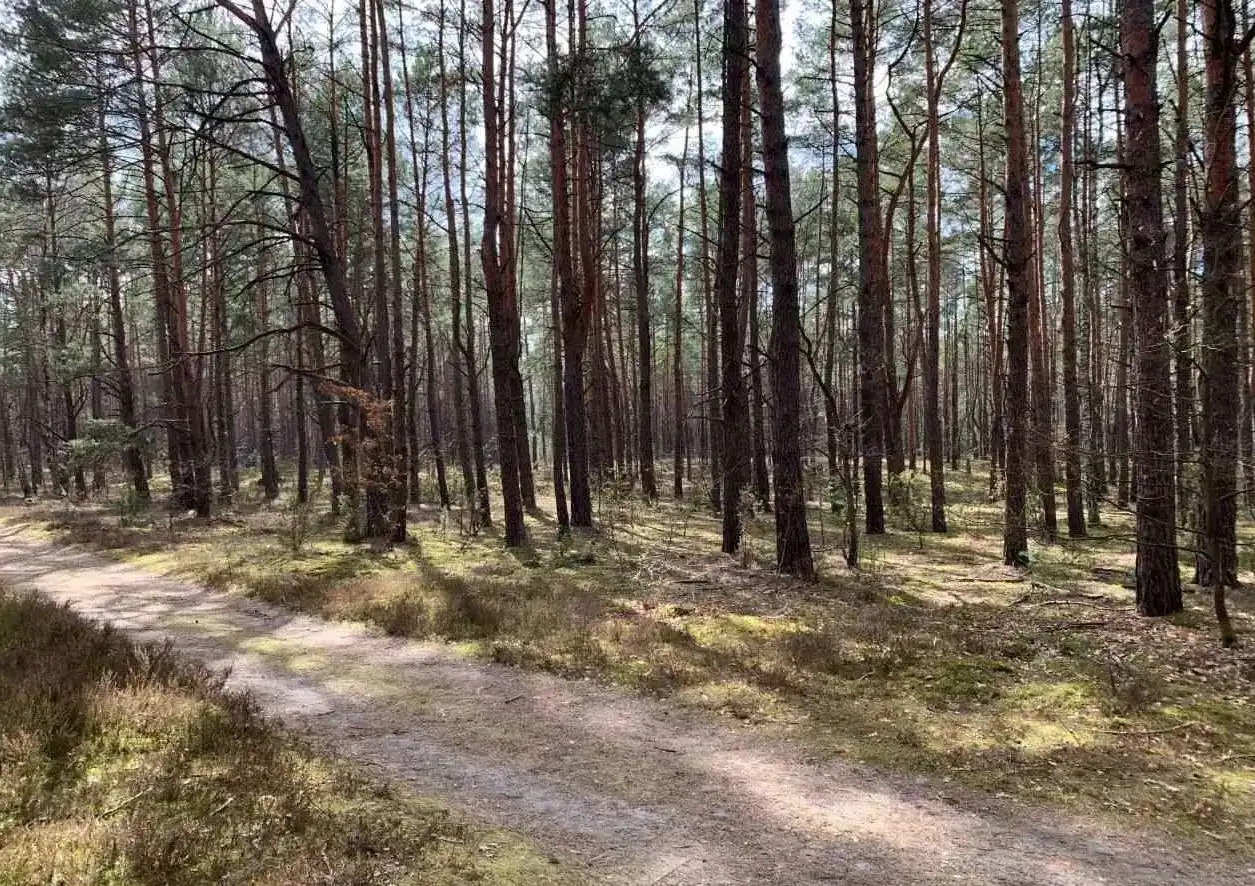 Działka płaska, porośnięta gdzieniegdzie sosnami. Dojazd drogą nieutwardzoną.