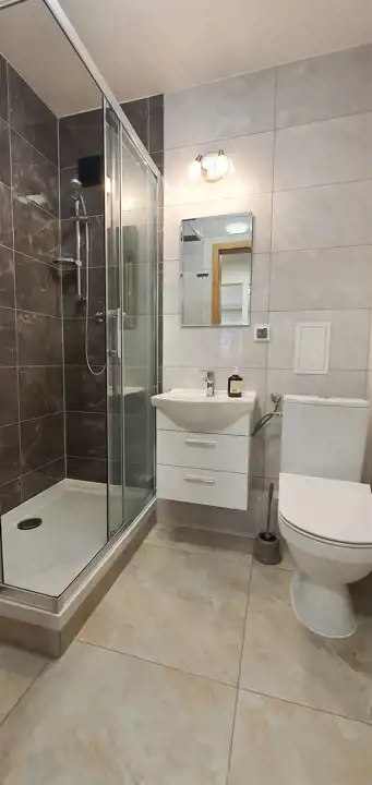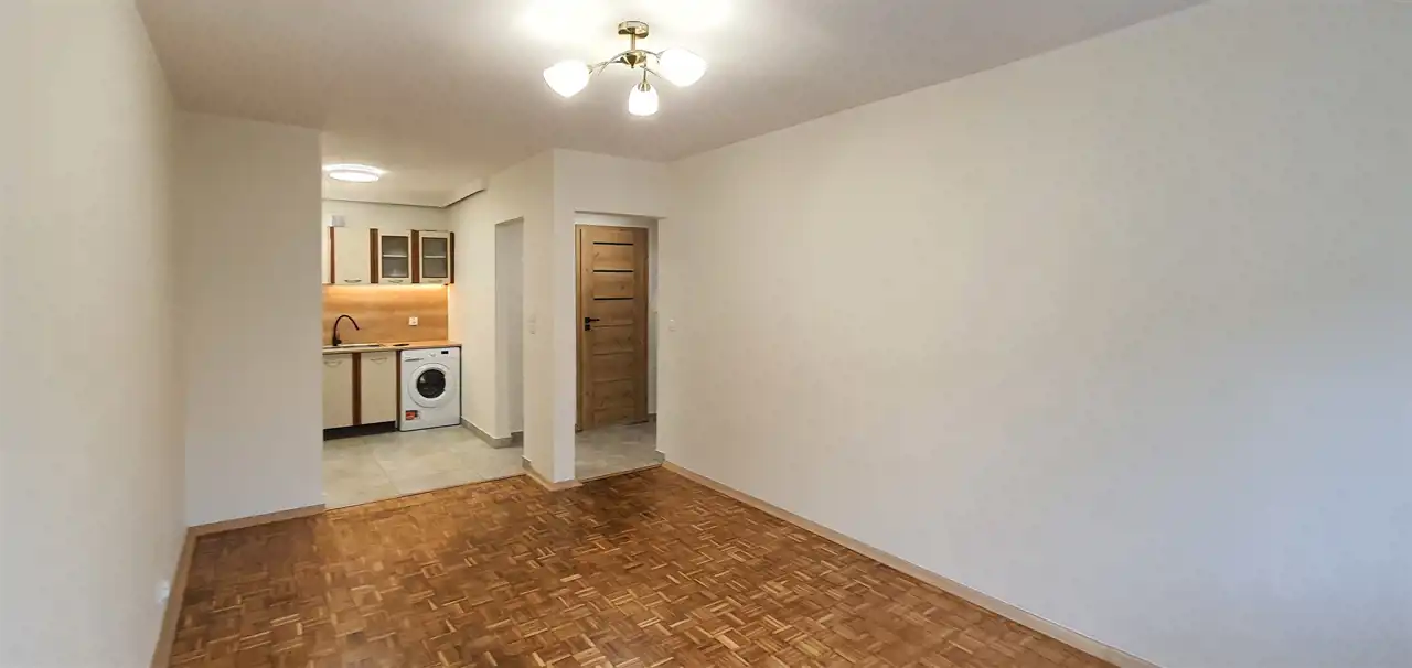 Kuchnia jest w pełni umeblowana i wyposażona w sprzęt AGD: lodówkę, płytę grzewczą, zlew oraz pralkę. W łazience nowoczesna kabina prysznicowa, estetyczna glazura i szafka z umywalką. W pokojach zadbane podłogi, świeżo odmalowane ściany oraz nowe oświetlenie.