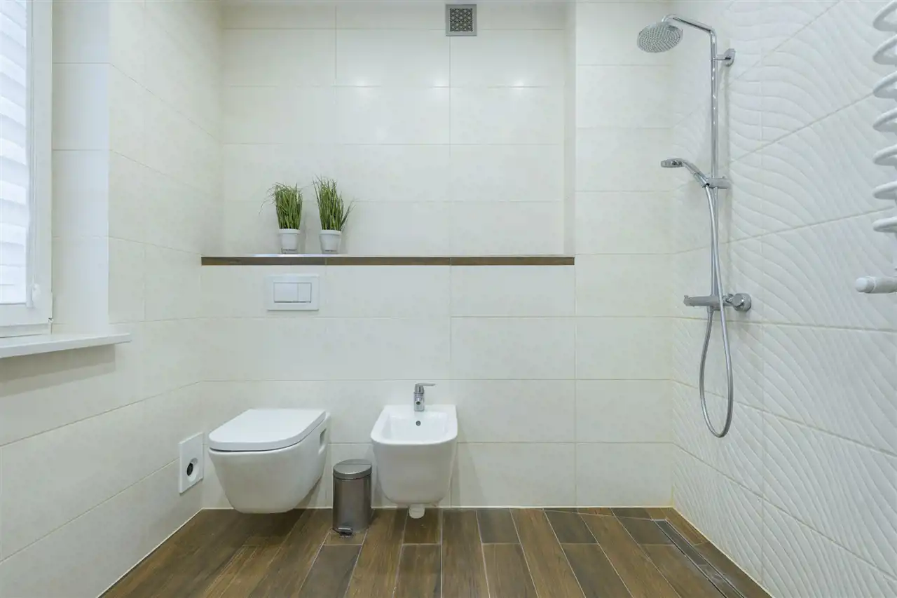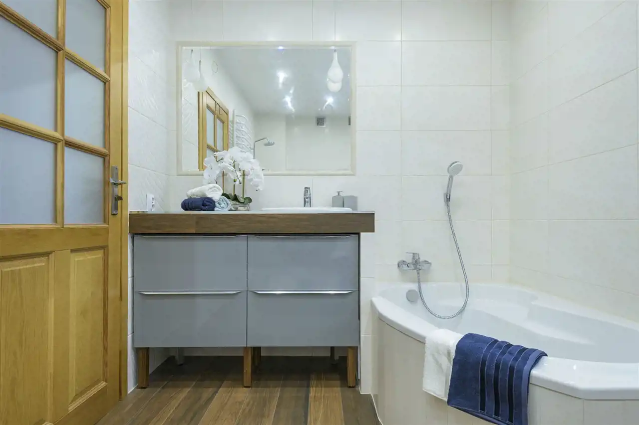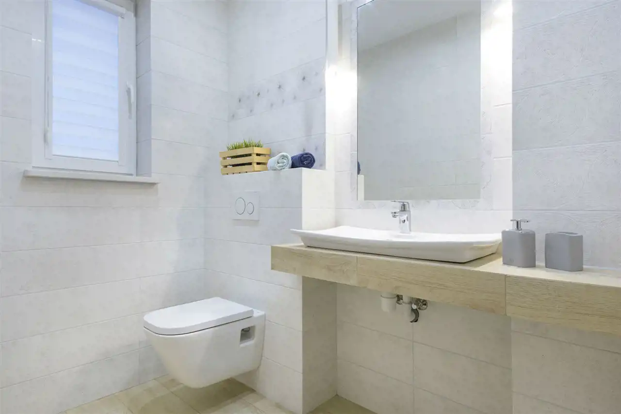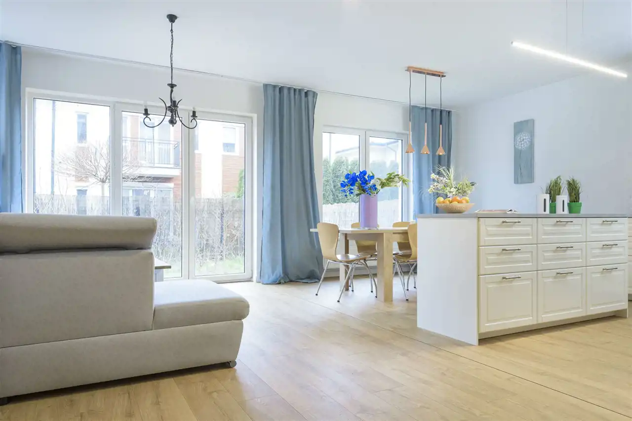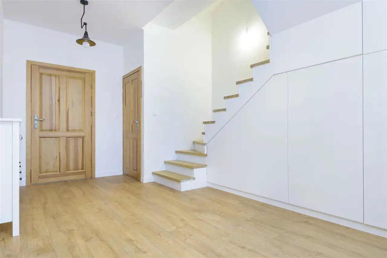 Zbudowany w 2015 roku. Składa się z trzech poziomów. Na parterze mamy piękny salon z aneksem kuchennym, który został wykończony z myślą o długim użytkowaniu. Wykorzystane materiały były wybrane dla siebie, a nie z myślą o inwestycji. Świadczy o tym fakt, że na podłodze mamy tutaj panel winylowy - bardzo trwały (wodoodporny) i jednocześnie świetnie imitujący drewno. Kuchnia była robiona pod wymiar. Jeżeli chodzi o toaletę, która również znajduje się na tym poziomie to wykorzystano tutaj płytki paradyż o grubości 1,1 cm oraz bardzo modny gres podłogowy.