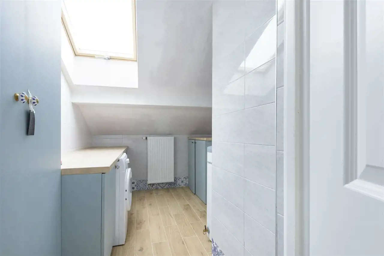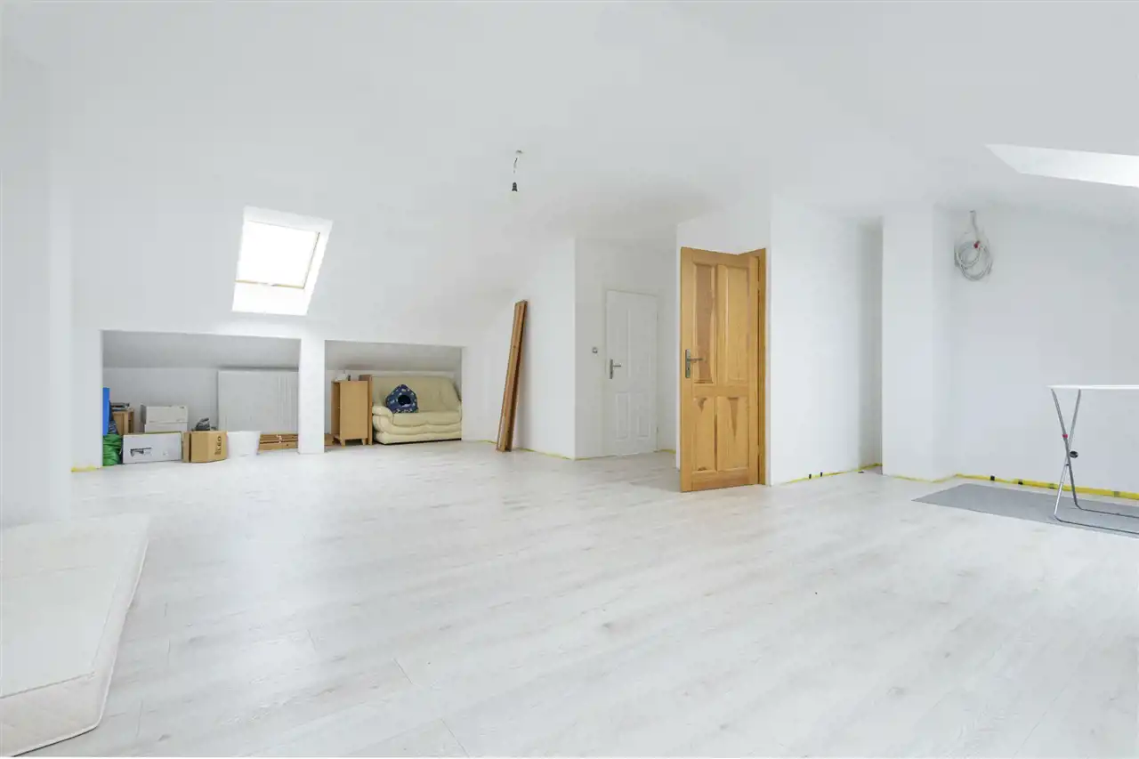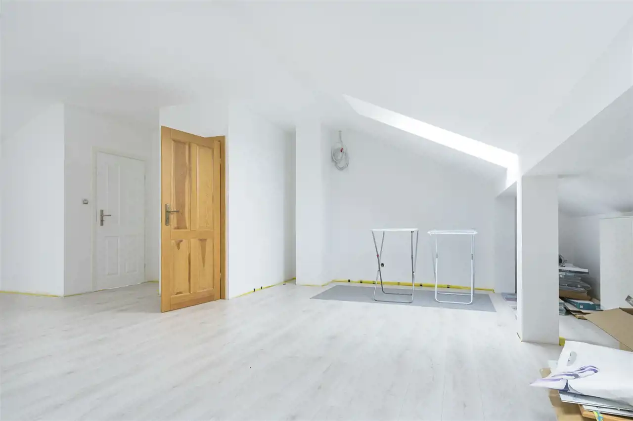 Na piętrze mamy dużą łazienkę z wanną i prysznicem oraz trzy bardzo ustawne sypialnie (dwie z balkonami). Dodatkowym atutem jest poddasze - po podłodze ma 65 m2 i świetnie nada się na pokój rozrywki ze stołem bilardowym i częścią telewizyjną. Obok jest pralnia - co jest bardzo praktycznym rozwiązaniem - nie trzeba zagracać łazienki suszarką do prania. Dom ogrzewany jest piecem gazowym dwu-funkcyjnym.