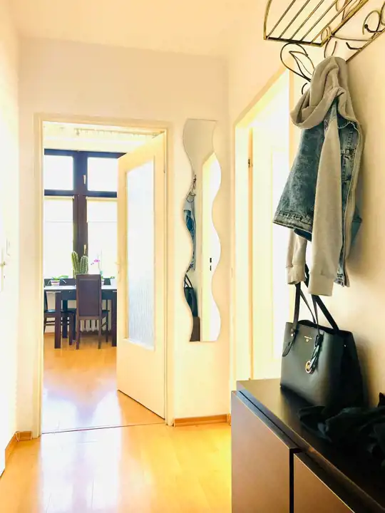 Po wejściu do mieszkania, z przedpokoju przechodzimy na prawo do pierwszego pokoju/sypialni, na lewo do łazienki, na wprost do salonu z aneksem kuchennym i drugą sypialnią.
