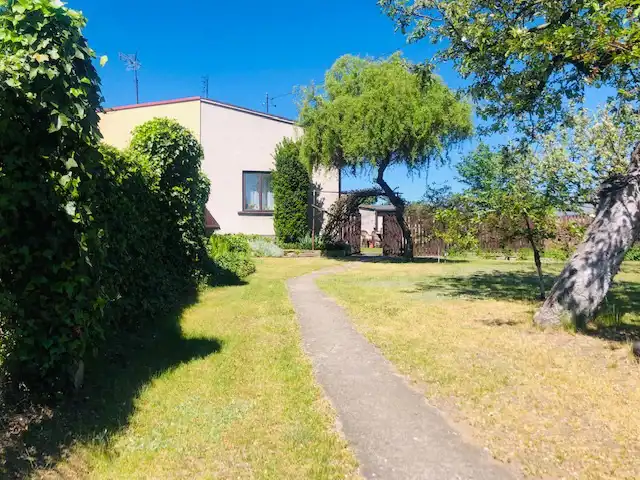Na jej tylnej części, w granicy działki znajdują się 2 budynki: mieszkalny i gospodarczy.
