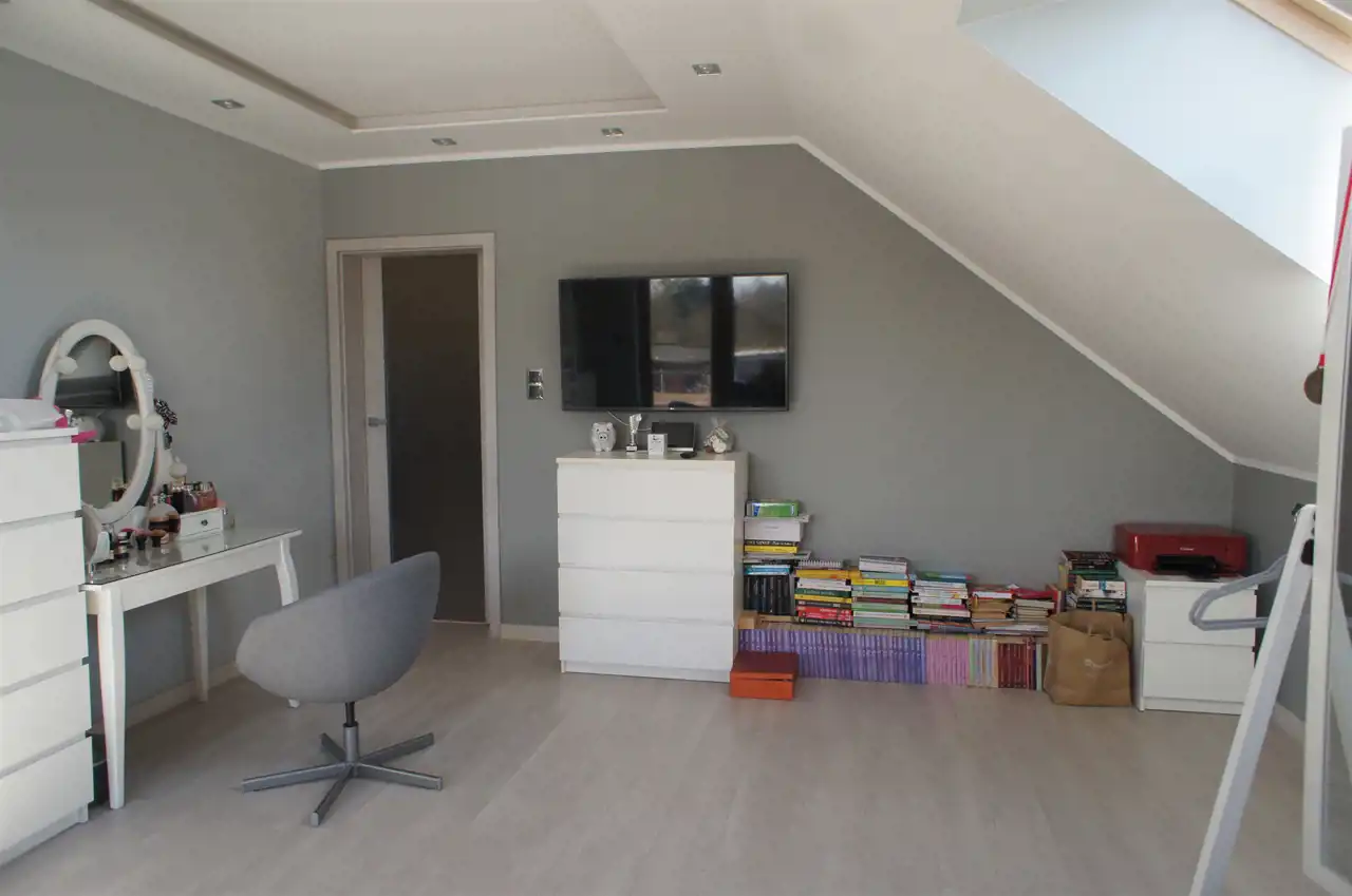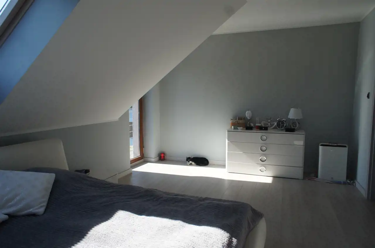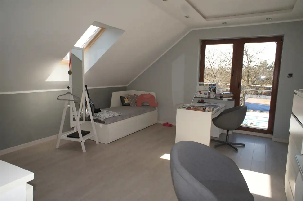 Na piętrze są trzy duże sypialnie, salon kąpielowy i garderoba.