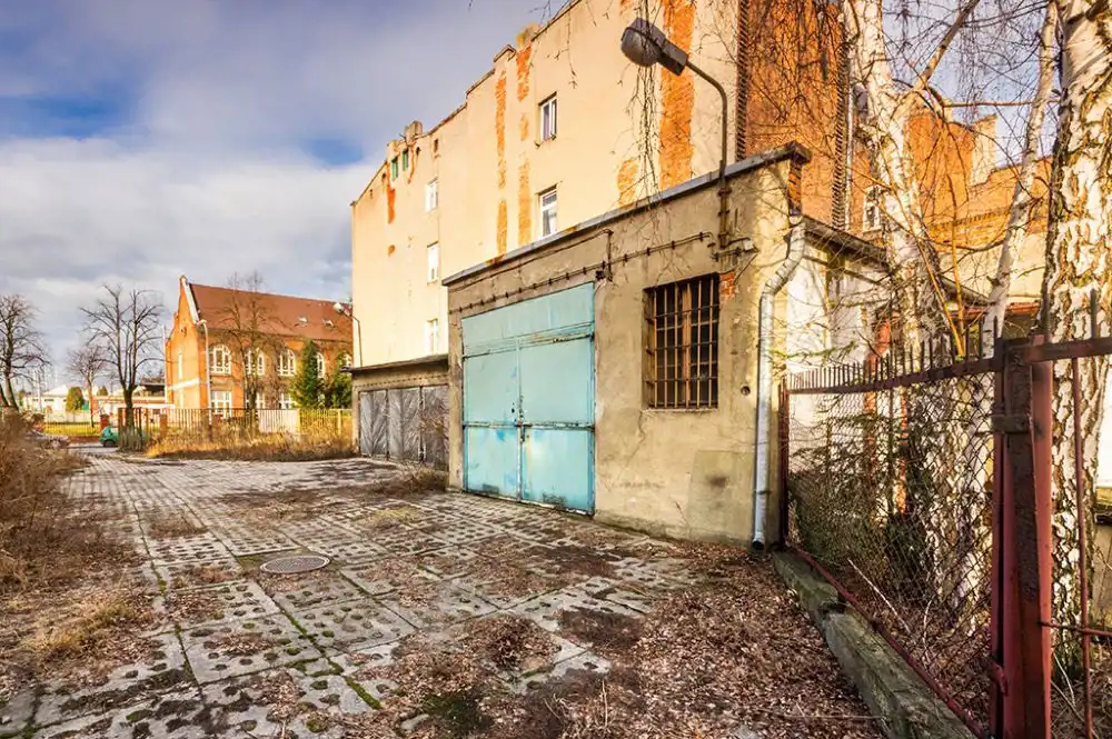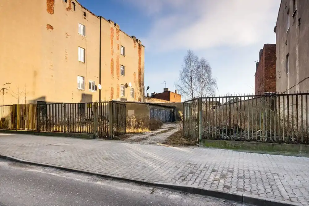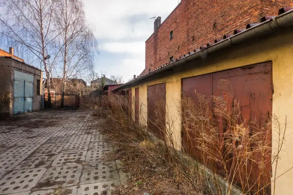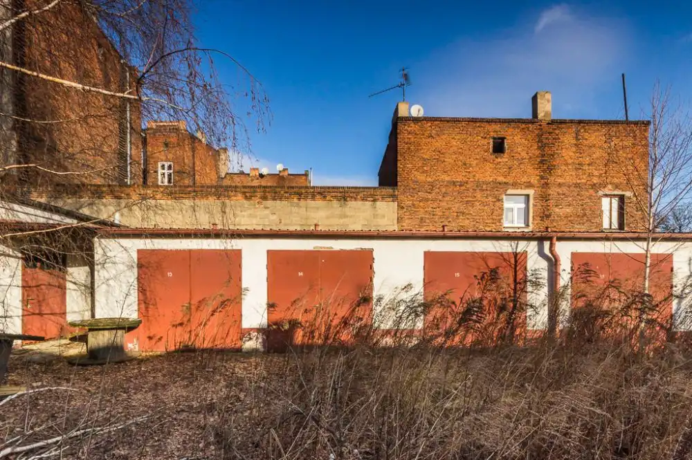 Nieruchomość zabudowana jest zespołem garaży w zabudowie szeregowej, budynkiem magazynowym – wiatą. Teren ogrodzony od frontu i od wschodu. Od strony północnej i południowej przylega bezpośrednio do zabudowań sąsiadujących. Teren utwardzony betonowymi płytami.