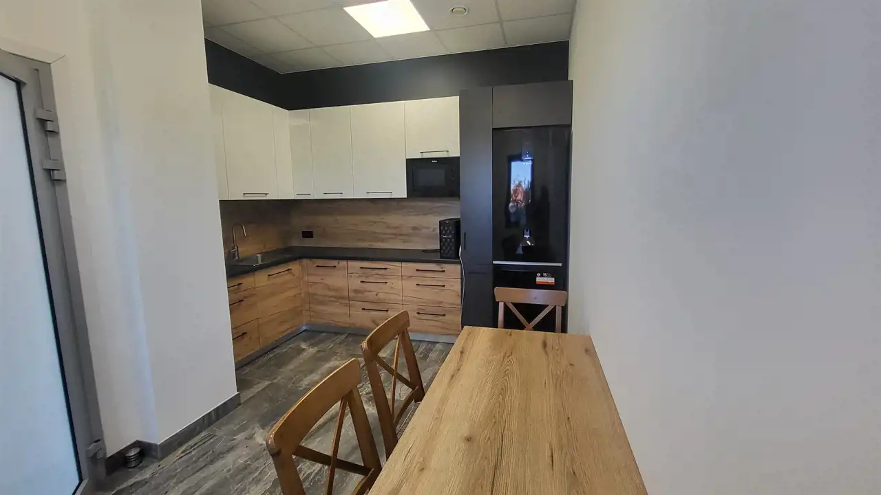 Piętro (ok. 158 m²): 2 duże pomieszczenia biurowe, w pełni wyposażony aneks kuchenny oraz łazienka.