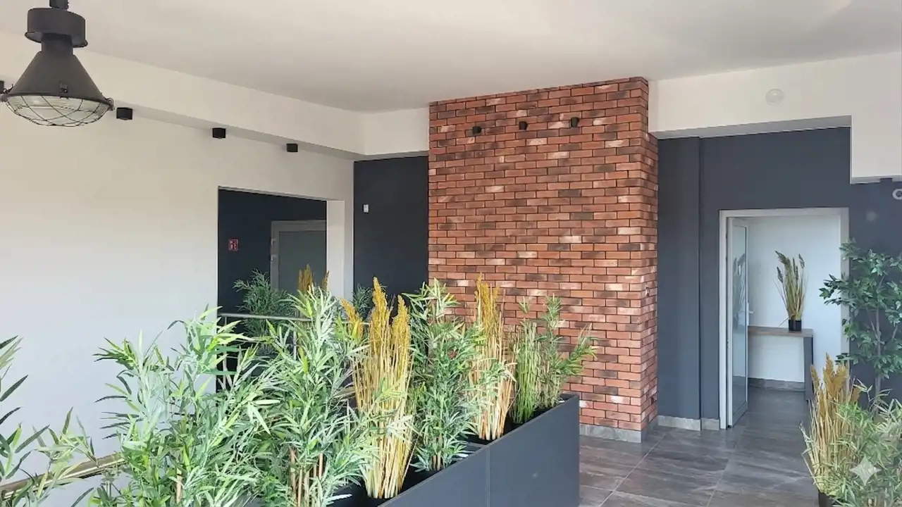 Nowoczesny design: Przeszklone wnętrza, stylowe detale z cegły, wysoka jakość materiałów.