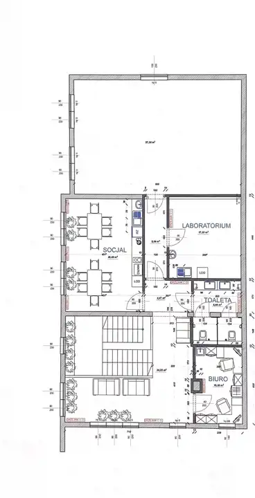 Parter (ok. 133 m²): Przestronne pomieszczenie biurowe, 2 szatnie oraz 2 łazienki.