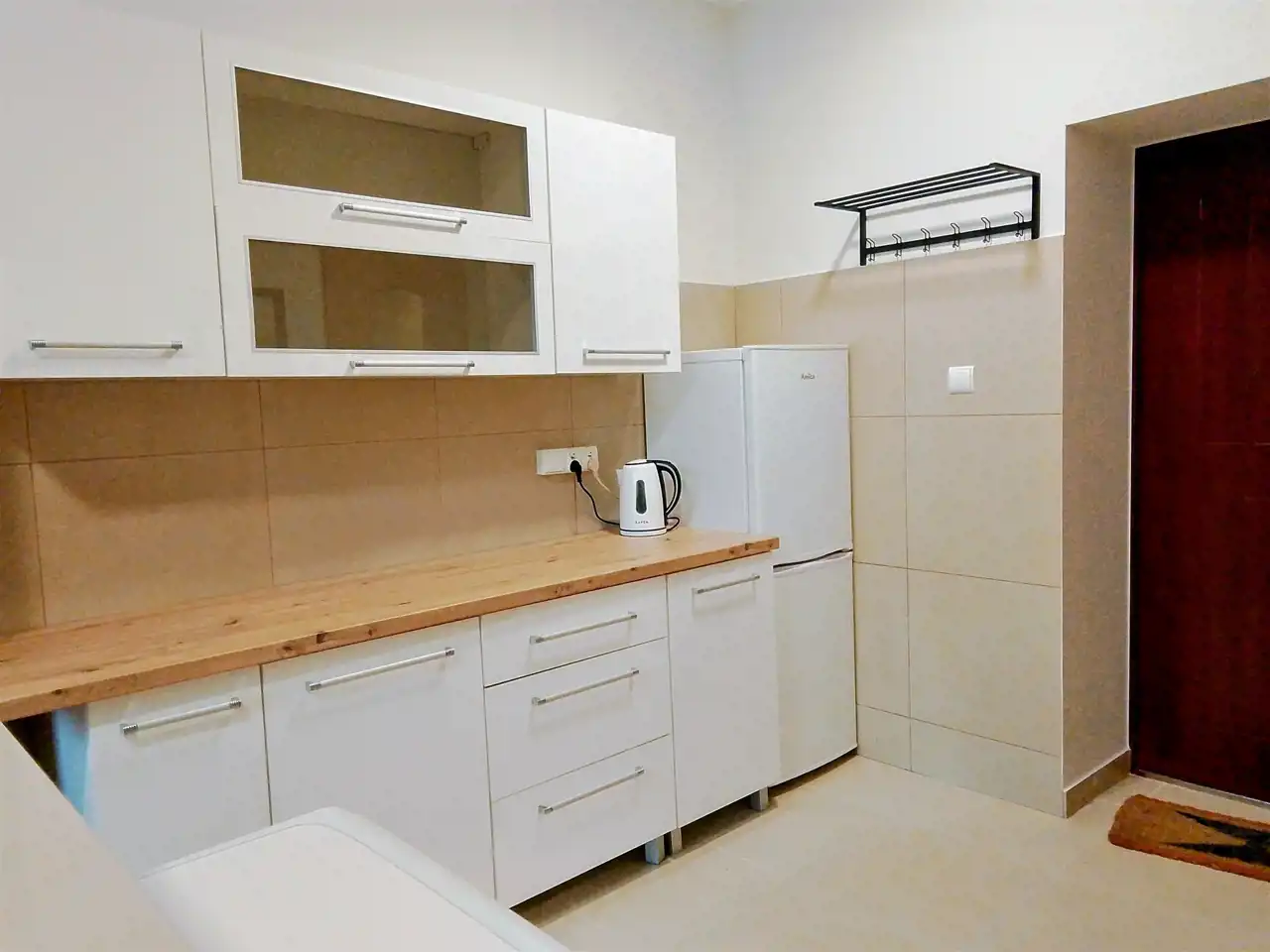 Lokal składa się z pokoju z aneksem kuchennym, wyposażonym w nowe meble kuchenne, lodówkę i pralkę oraz łazienki z WC i prysznicem.