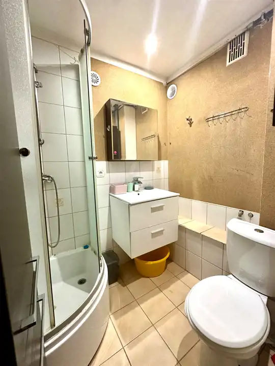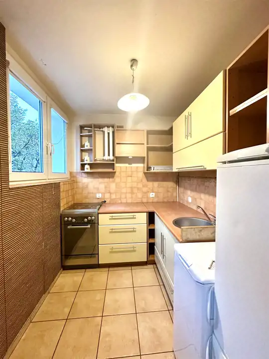 W pokoju i przedpokoju duże szafy na wymiar, meble w kuchni w zabudowie. Całość do odświeżenia.