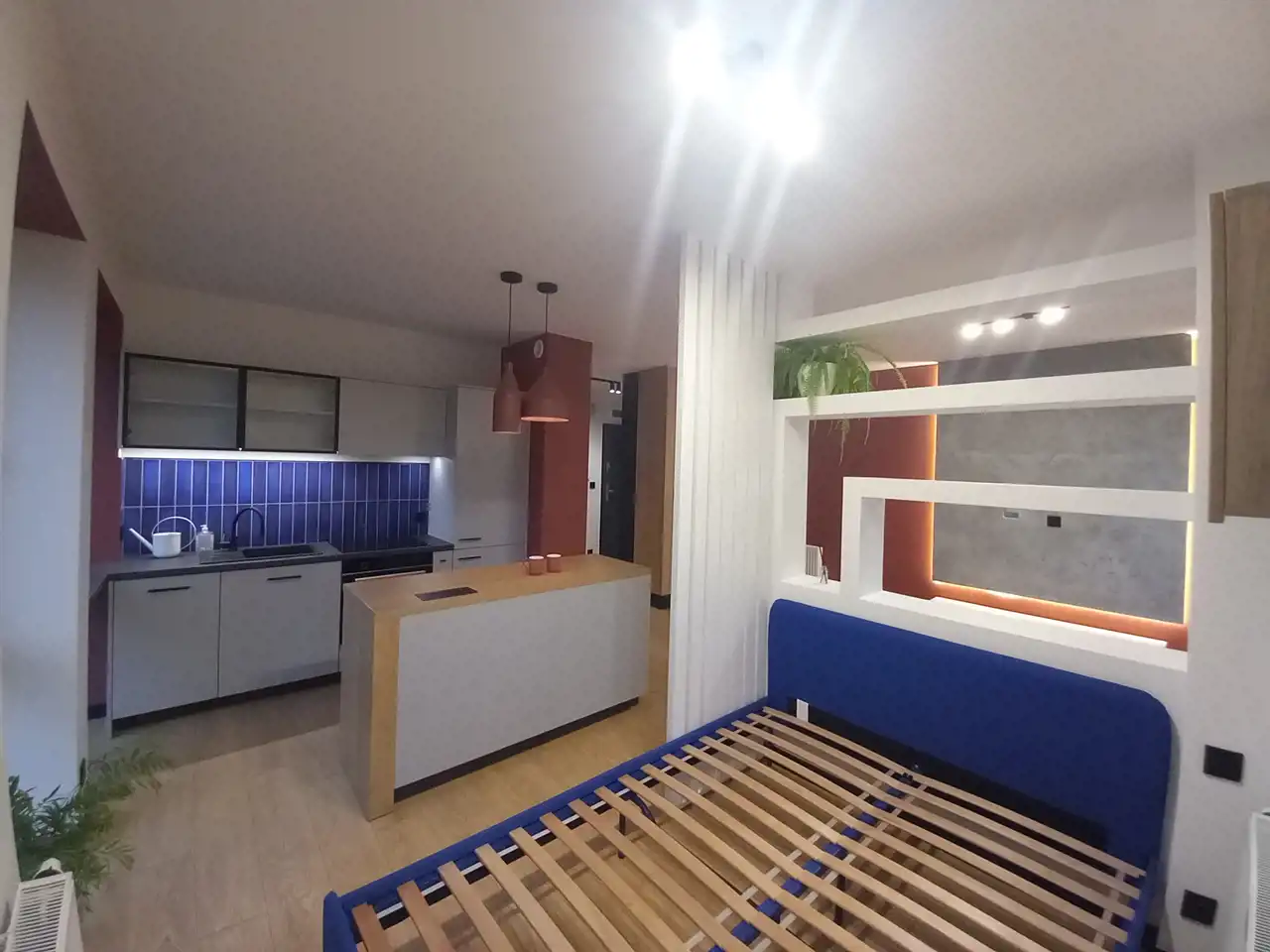 Przestronny, jasny salon z aneksem kuchennym i wydzieloną częścią sypialnianą,