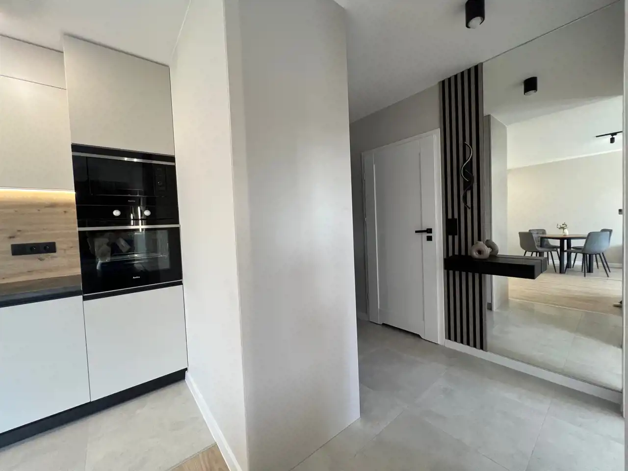 W skład mieszkania wchodzi przestronny salon z kuchnią, w pełni wyposażony w nowoczesne sprzęty AGD. Sypialnia, która pozostaje nieumeblowana, daje możliwość aranżacji wnętrza według własnych potrzeb i upodobań. Łazienka z WC to funkcjonalne pomieszczenie, wykończone w wysokim standardzie, z kabiną prysznicową i nowoczesnymi sanitariatami. Przedpokój z dużą szafą, która zapewnia wygodę przechowywania, stanowi praktyczne rozwiązanie.