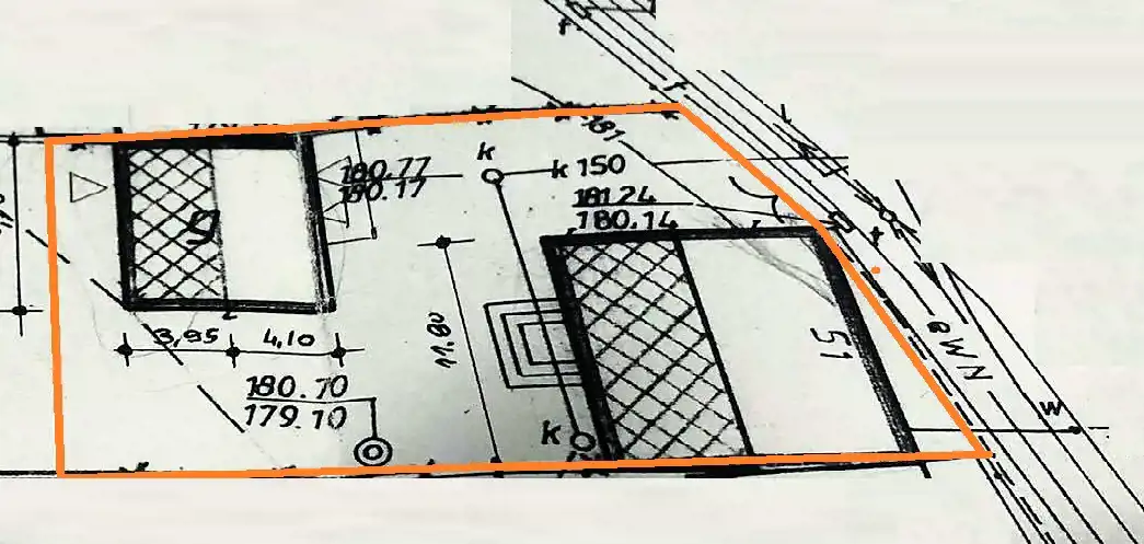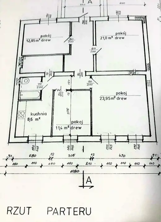 - na działce posadowione dwa budynki. Jeden o charakterze mieszkalnym (do aranżacji, remontu) o pow. użytkowej 102 m2 składający się z 4 pomieszczeń, kuchni, łazienki oraz pomieszczenia gospodarczego. Wybudowany w latach 60-tych, rozbudowywany przed 1995 rokiem. Budynek w linii chodnika.