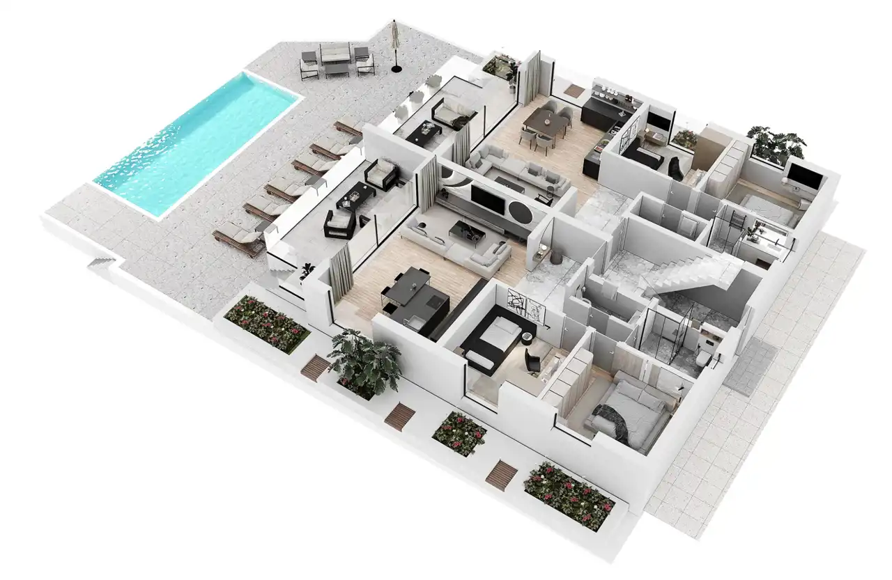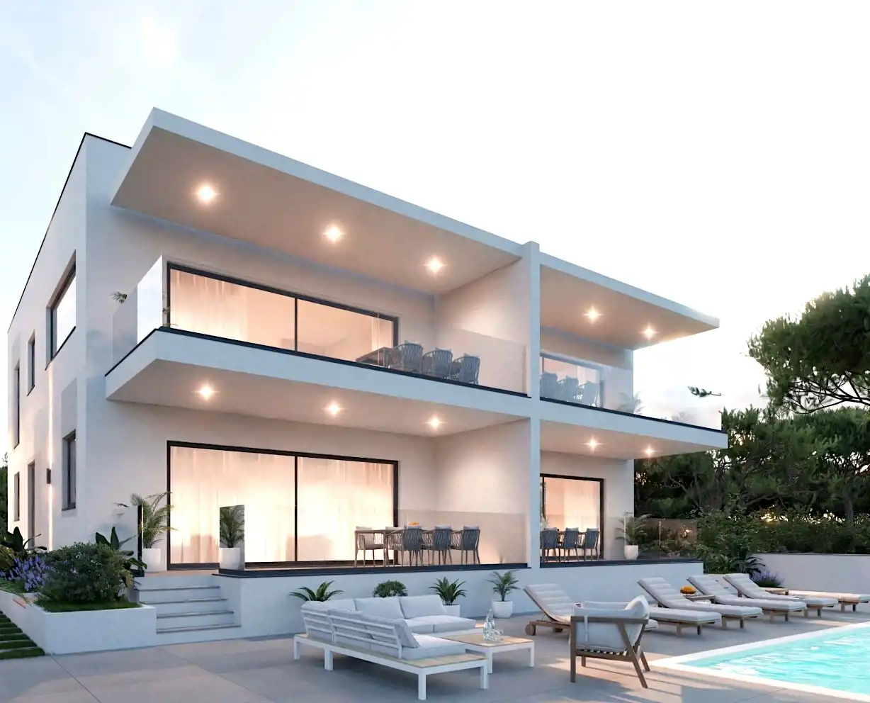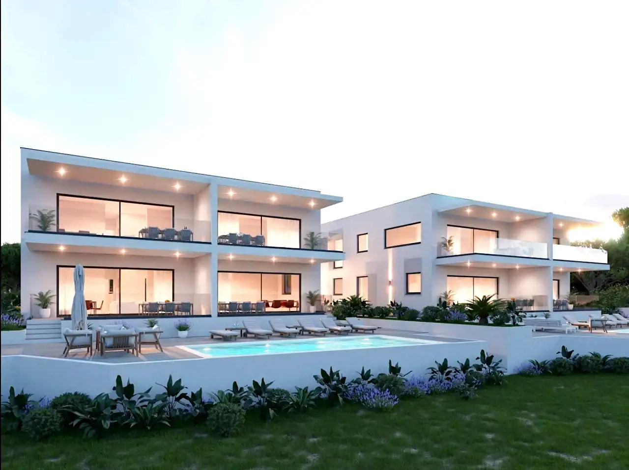 Na działce o powierzchni 828,00 m², powstała 2-kondygnacyjna nieruchomość z czterema apartamentami. Każdy apartament posiada powierzchnię 94,48 m² wraz z tarasem, dwiema sypialniami, salonem z aneksem kuchennym, łazienką i toaletą. Od strony morza umiejscowiony jest basen a na tyłach parking.