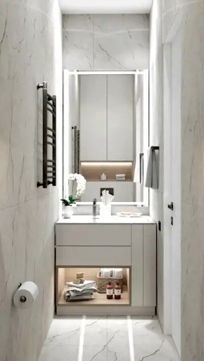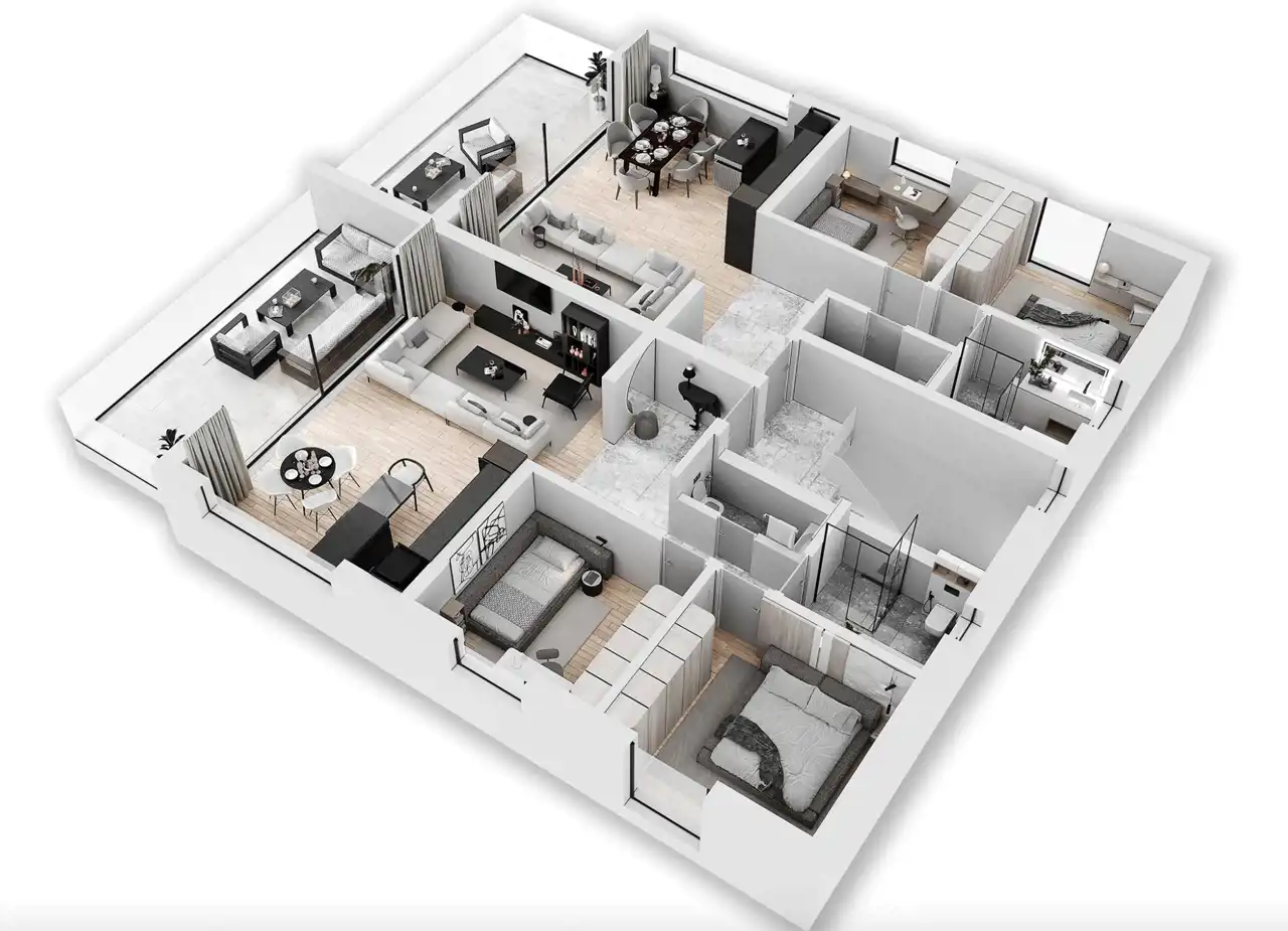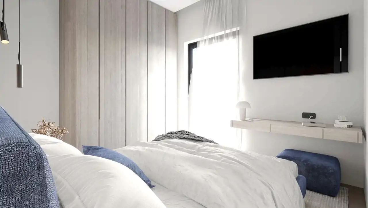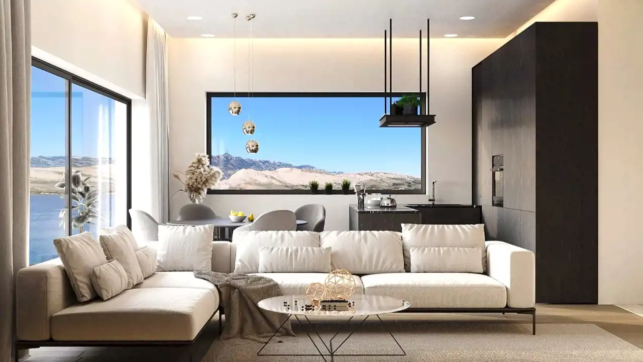 Każdy apartament oferuje 74,13 m² powierzchni podłóg oraz 20,35 m² tarasu z widokiem na morze. Przestronny salon posiada ogromne okno przesuwne okno typu HS. Otwarta kuchnia komponuje się przedsionkiem oraz korytarzem prowadzącym do dwóch sypialni. W tylnej części znajduje się łazienka oraz oddzielna toaleta.