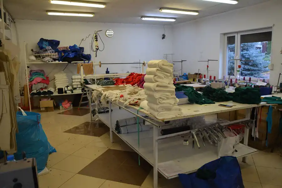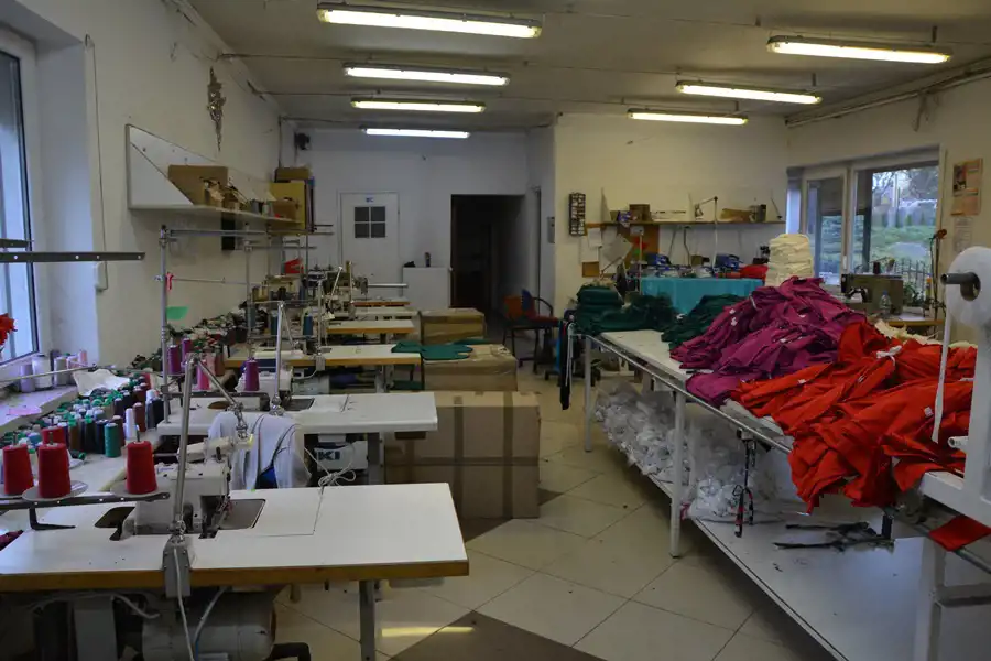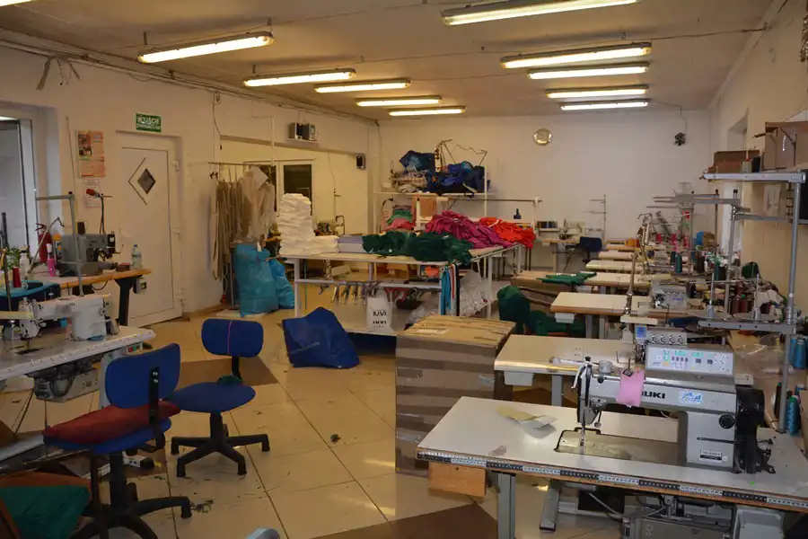 W skład lokalu wchodzi: duża powierzchnia magazynowa (na tą chwilę pomieszczenie ze stanowiskami do szycia), a także biuro, kuchnia pracownicza, pomieszczenie magazynowe, kotłownia oraz łazienka z WC. Budynek ogrzewany jest piecem dwufunkcyjny gazowym znajdującym się w kotłowni.