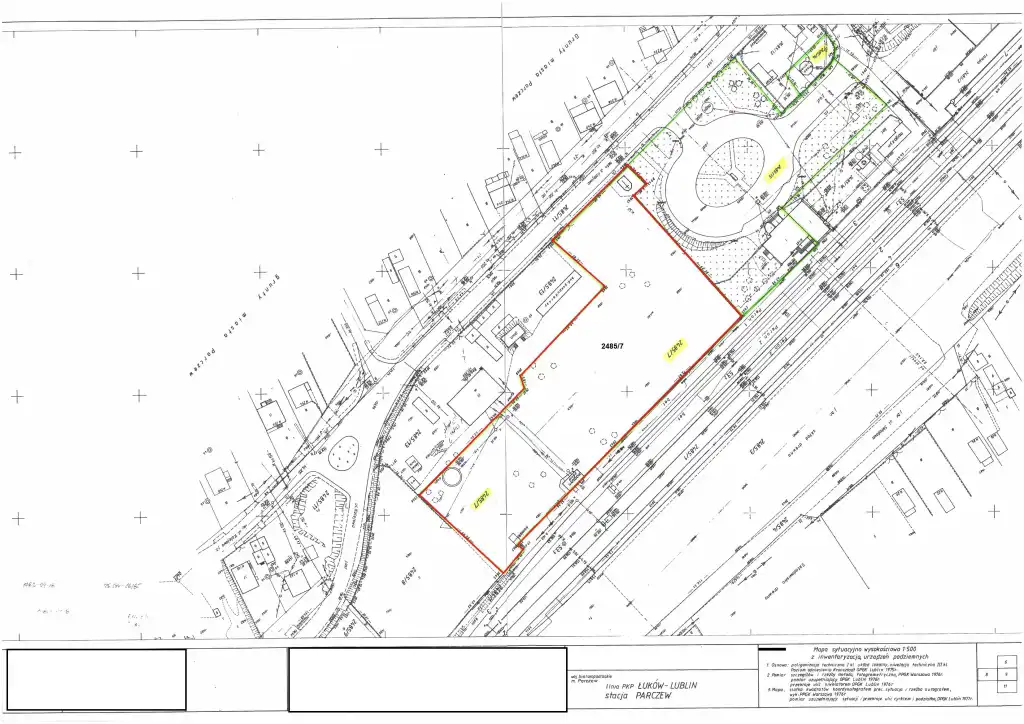 Działka nr 2485/7, obręb Parczew gm. Parczew M. o pow. 0,7901 ha położona w sąsiedztwie dworca kolejowego w Parczewie oraz ulicy Kolejowej. Działka porośnięta drzewami liściastymi.