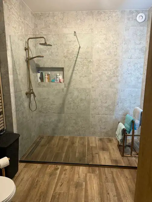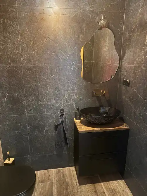 Łazienka i toaleta doskonale się uzupełniają. Tutaj spokojne barwy tworzą spójną całość z naturalnymi kształtami i materiałami.