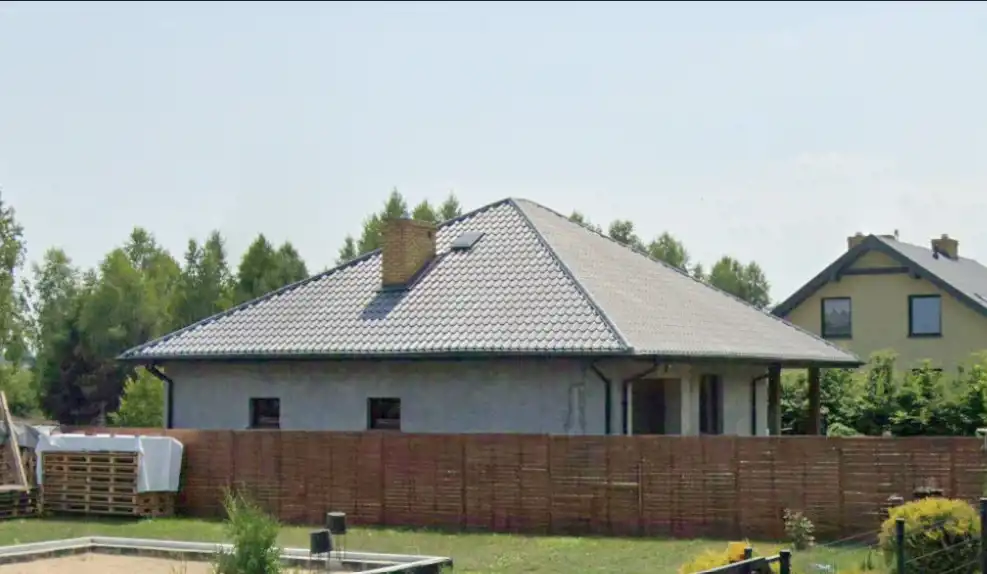 - Dach budynku czterospadowy (kopertowy) kryty blachodachówką.