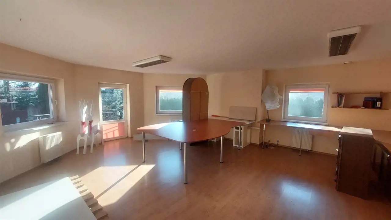 Prezentujemy wyjątkową nieruchomość inwestycyjną o powierzchni 593 m2 na działce 2500 m2. Z ogromnym potencjałem, idealną dla firm usługowych, produkcyjnych, handlowych, a także na cele mieszkaniowe, poradnie medyczne, centrum spa i wellness, pensjonatowo-hotelowe lub dom seniora. Obiekt z możliwością własnej adaptacji, na parterze trzy duże pomieszczenia 66 m2, 113 m2, 173 m2 oraz powierzchnia biurowa 146 m2 i garaż 32 m2 . Dodatkowo, na piętrze dwa pomieszczenia i łazienka, łącznie 63 m2.