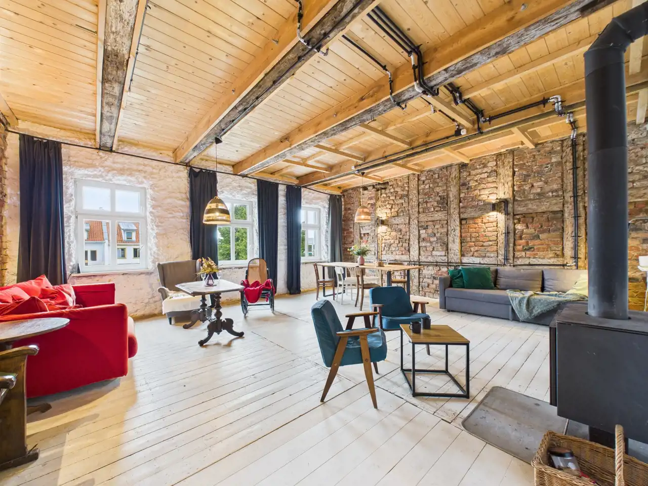 106 m2 otwartej przestrzeni- wysokie sufity, duże okna i industrialny charakter wnętrza tworzą wyjątkową atmosferę z ogromnym potencjałem aranżacyjnym.