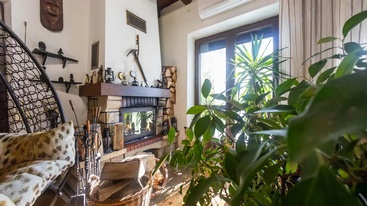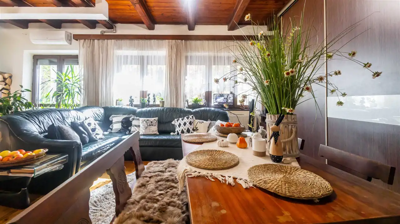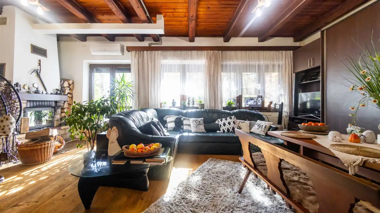 - Obszerny salon z kominkiem (32 m2), który zapewni przytulny klimat w chłodniejsze dni. Salon ma bezpośrednie wyjście na taras o powierzchni około 40 m² z pięknym widokiem na lasy i góry.