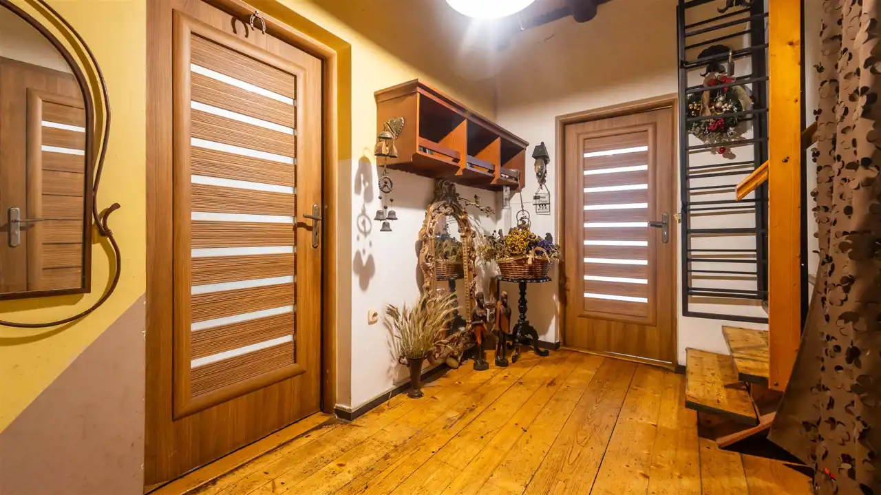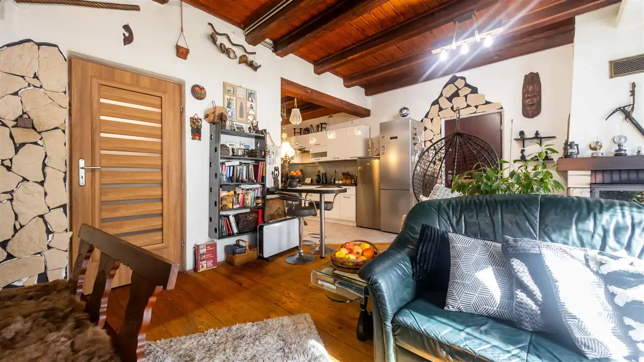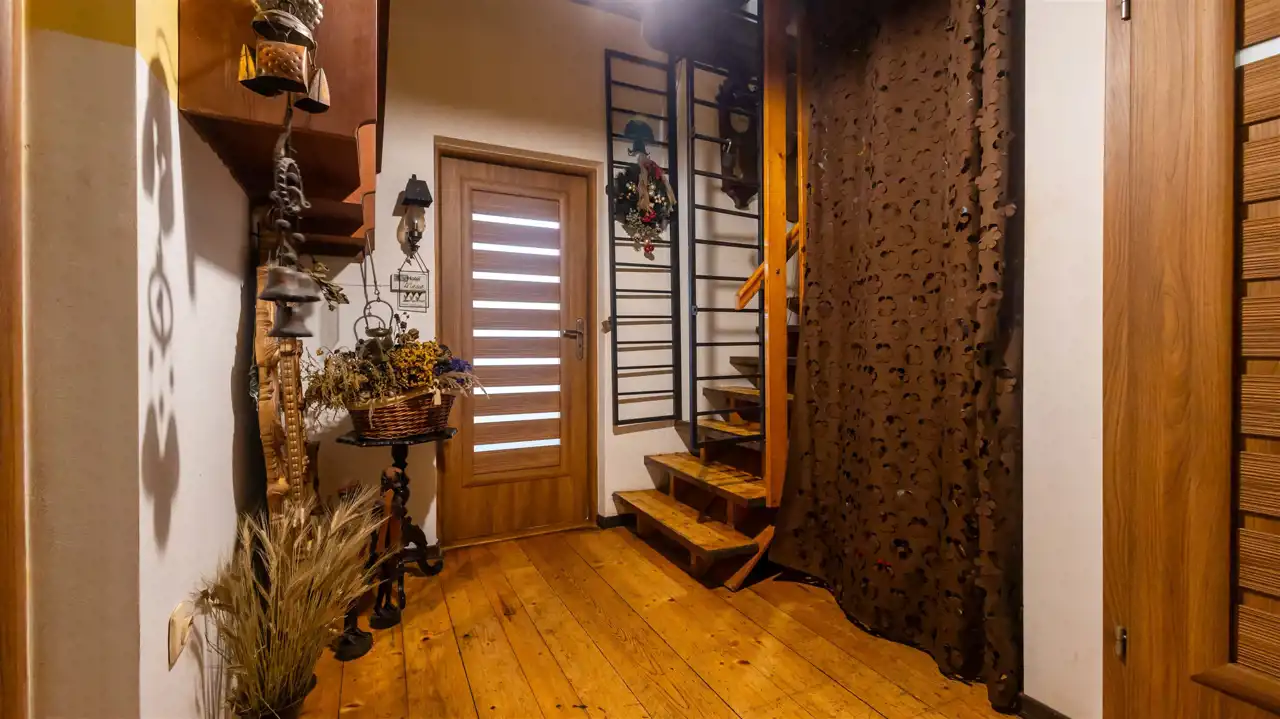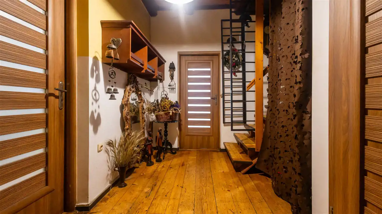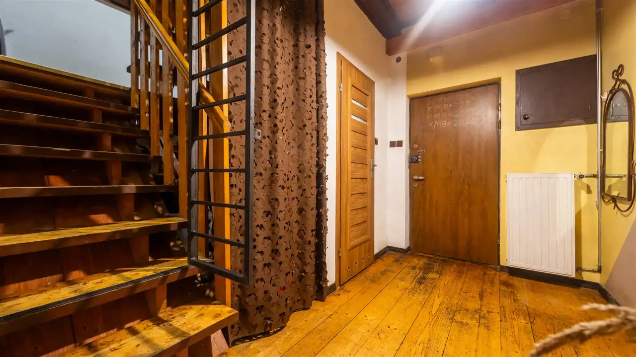 - Niezależny apartament z osobnym wejściem o powierzchni około 12 m2, aneksem kuchennym, łazienką oraz zejściem do sauny (ze względu na turystyczną okolicę można wykorzystać tę przestrzeń do wynajmu i uzyskiwać dodatkowy dochód)