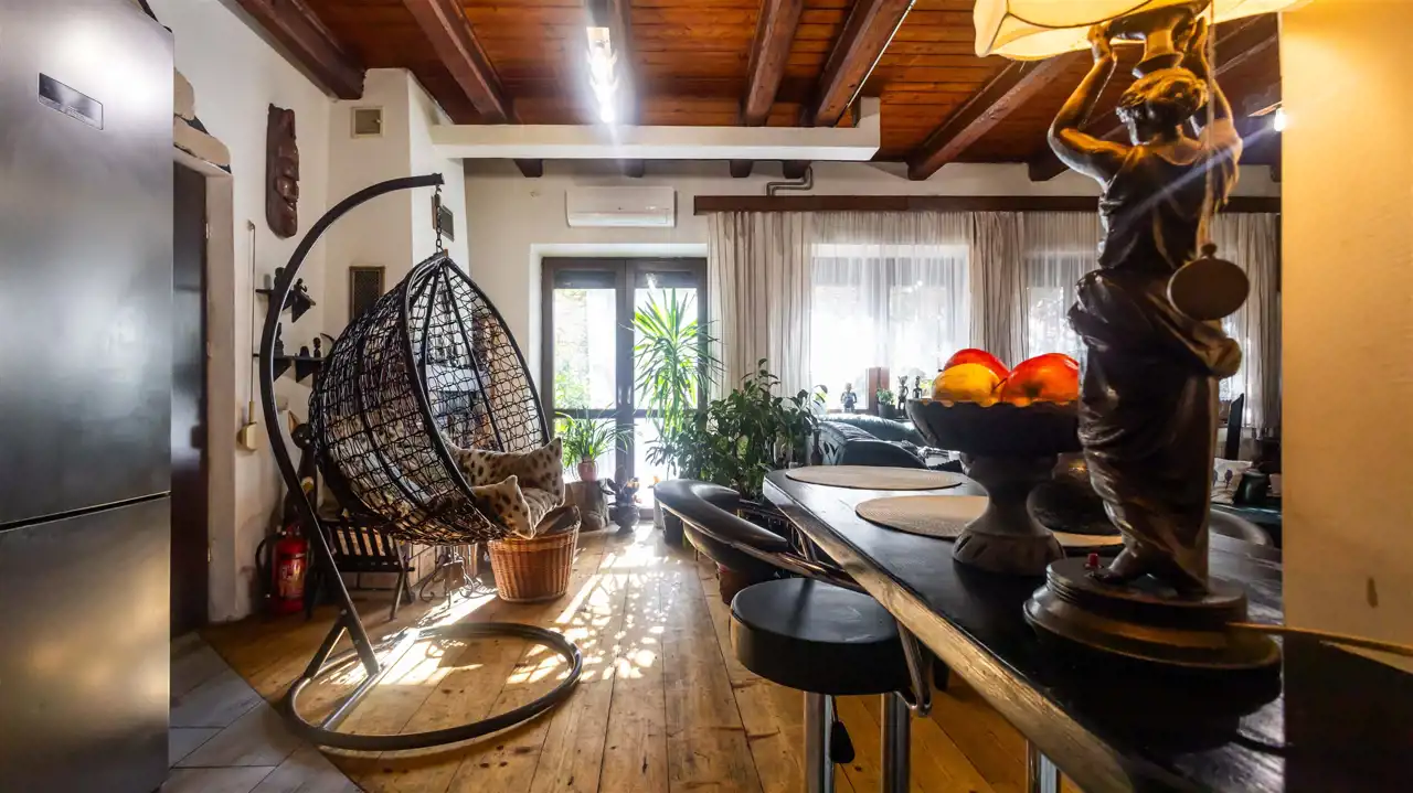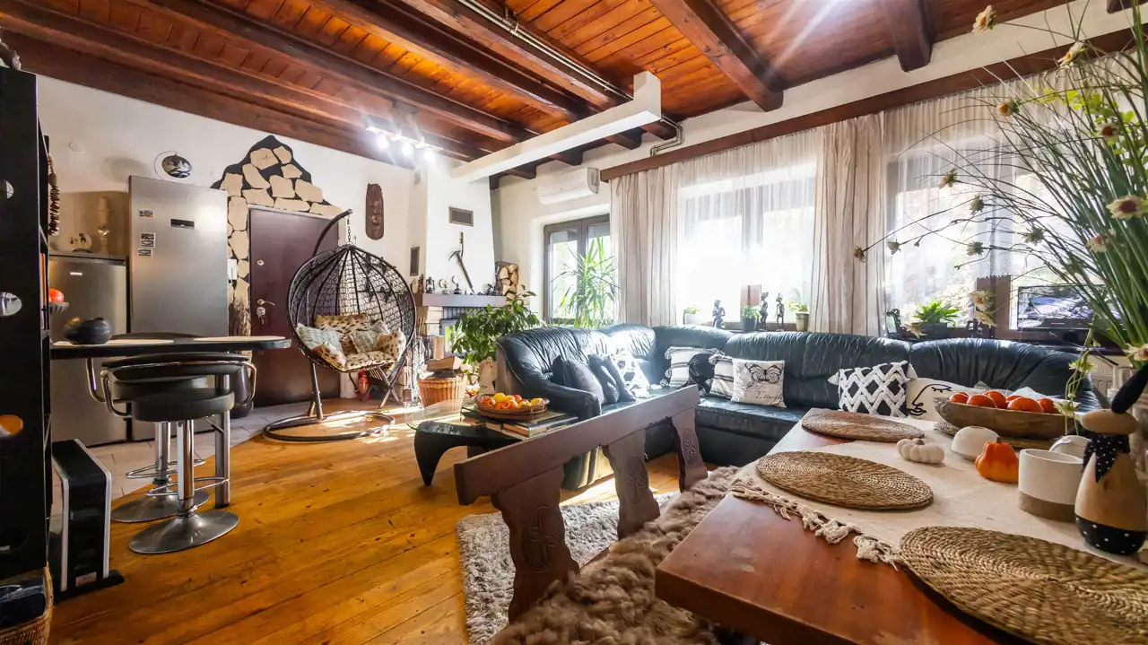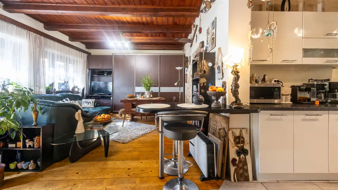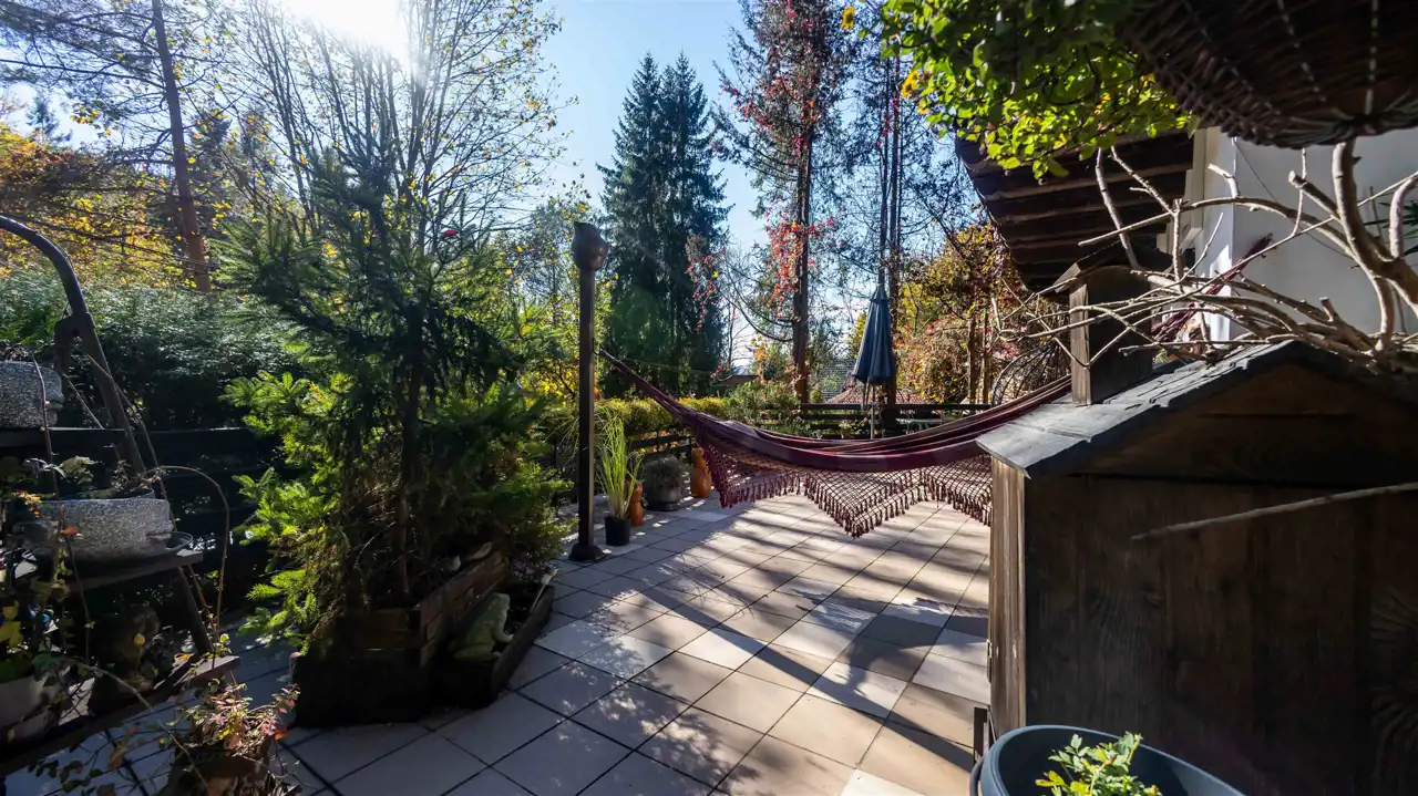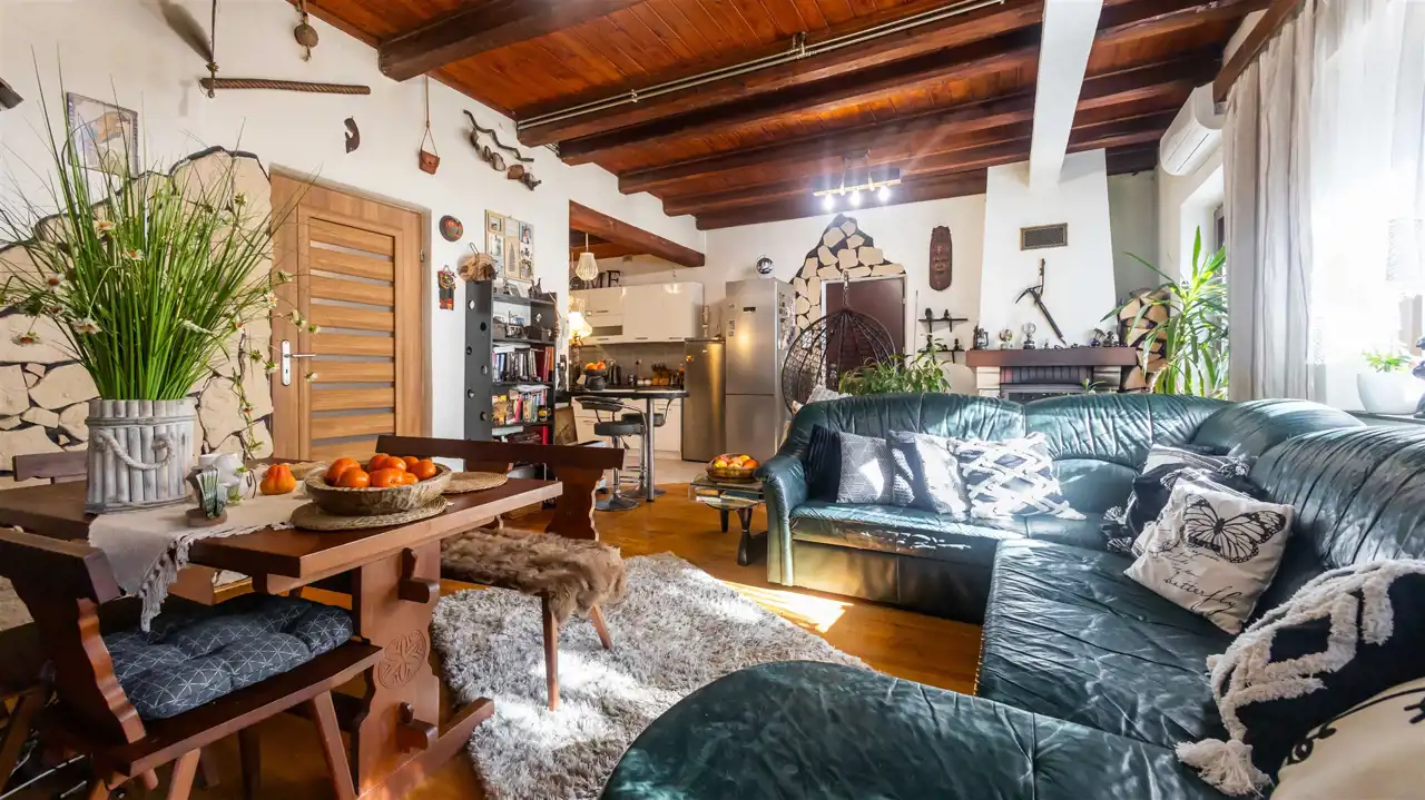 - Niezależny apartament z osobnym wejściem o powierzchni około 12 m2, aneksem kuchennym, łazienką oraz zejściem do sauny (ze względu na turystyczną okolicę można wykorzystać tę przestrzeń do wynajmu i uzyskiwać dodatkowy dochód)