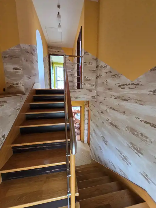 Piętro: dwie sypialnie, duży salon z wyjściem na balkon od strony południowej, duża kuchnia, korytarz i przestronna łazienka,