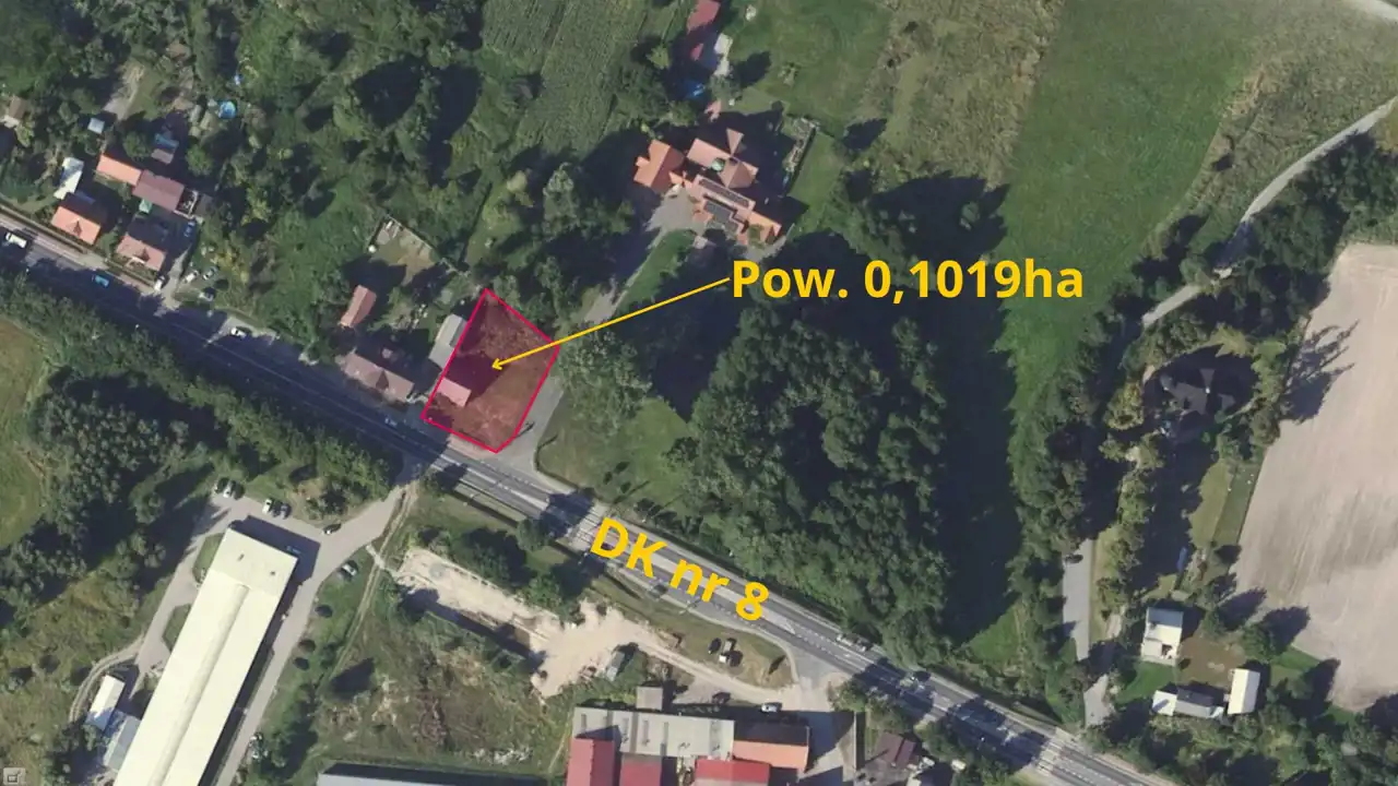 Działka położona bezpośrednio przy drodze krajowej DK nr 8. Nieruchomość jest częściowo zabudowana domem do generalnego remontu lub do rozbiórki. Działka może być wykorzystana zarówno na cele mieszkaniowe jak i na usługi czy handel. Usytuowanie działki w kierunku południowo – północnym. Okolica luźno zabudowana domami jednorodzinnymi.