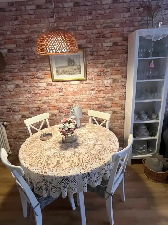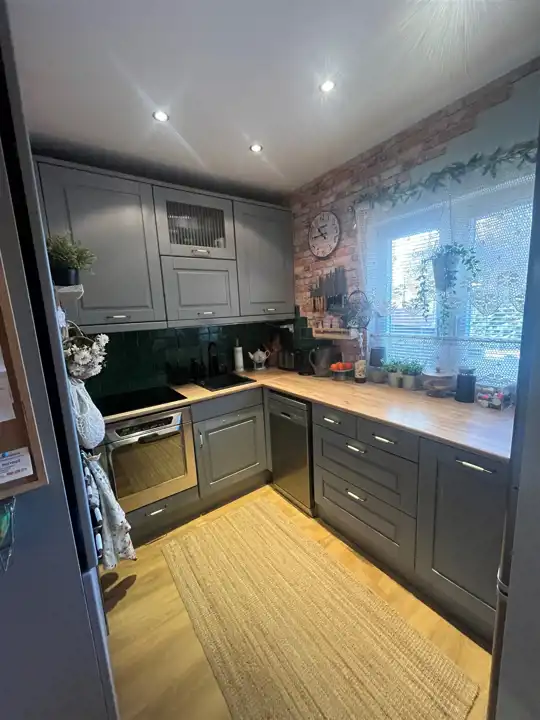 Kuchnia ,która jest otwarta na salon ,jest urządzona w najmniejszym szczególe przez obecną właścicielkę ,która jest świetna przy przygotowaniu pysznych posiłków dla całej rodziny ma ogromną lodówkę