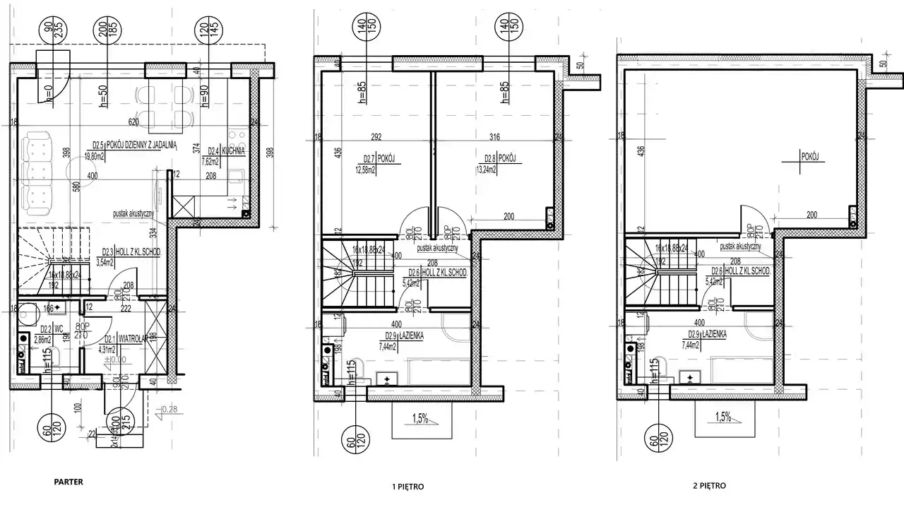 PIĘTRO I: 2 sypialnie (13,24 m2, 12,58 m2), duża łazienka z oknem (7,44 m2), holl z klatką schodową (5,42 m2).