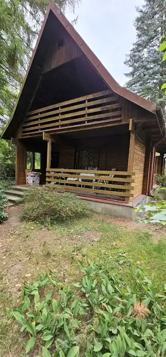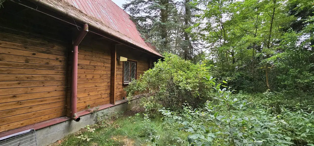 Działka w Głoskowie o powierzchni 1913 m2 zabudowana drewnianym, podpiwniczonym częściowo domem o powierzchni zabudowy 46 m2 i powierzchni użytkowej około 70 m2.