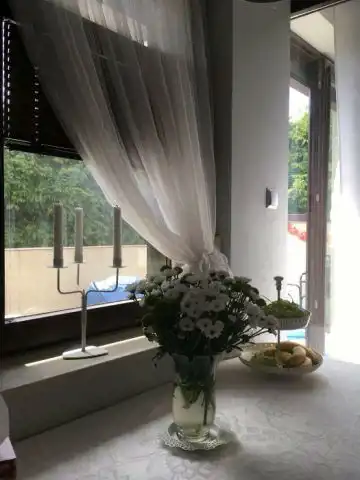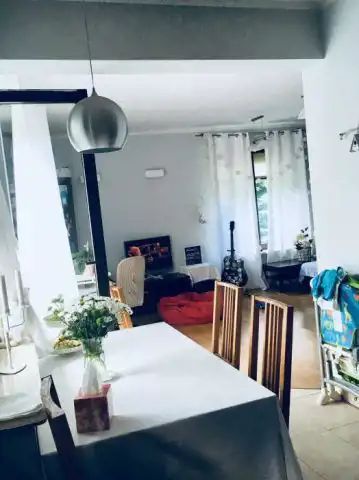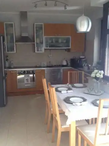 Komfortowy duży salon z tarasem i widokiem na szpaler zieleni, wyposażony w wygodną kanapę, jadalnia i duża nowoczesna kuchnia. Kuchnia wyposażona jest w dużą rodzinną lodówkę, zmywarkę, mikrofalówkę oraz akcesoria tj. garnki, patelnie, sztućce, talerze, czajnik itd…