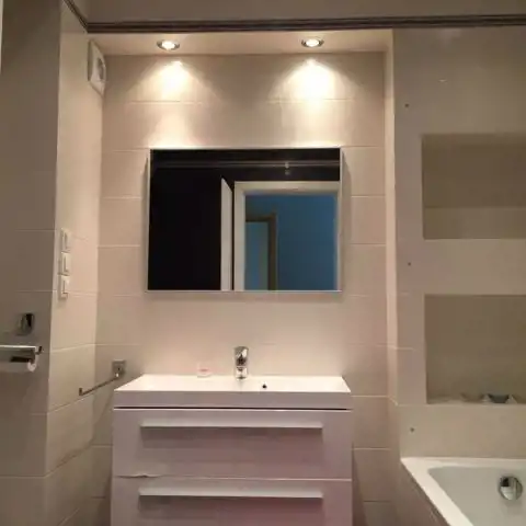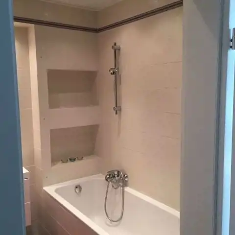Ładna, zadbana łazienka z ogrzewaniem podłogowym oraz wygodną wanną z opcją brania tylko prysznica, podwójna umywalka, pralka i szafy